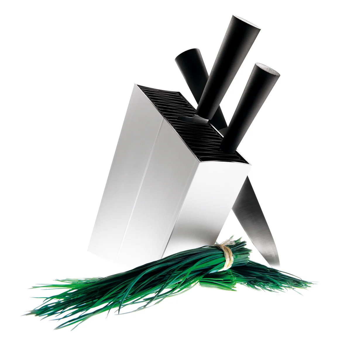 Le bloc à couteaux deEva Solo fut dessiné par les designers Claus Jensen et Henrik Holbæk de Tools Design. Dans la coque en aluminium poli se trouve un insert en matière plastique composé de lignes ondulantes, dans lesquelles pourront se lover non seulement vos couteaux, mais aussi vos ustensiles de cuisine. L'insert est amovible et facile à nettoyer, ce qui n'est pas souvent réalisable sur des blocs classiques.