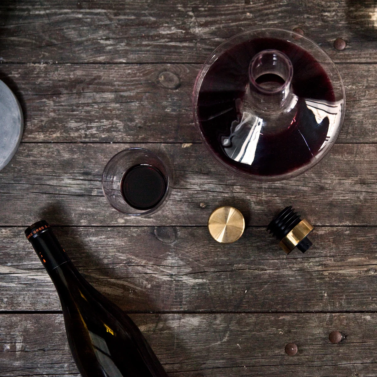 Ouvrez une bouteille de vin, placez le Audo Wine Breather Deluxe au-dessus de l'ouverture et retournez les deux - le vin passera à travers le décanteur et dans la grande carafe perforée. Pour une aération parfaite.