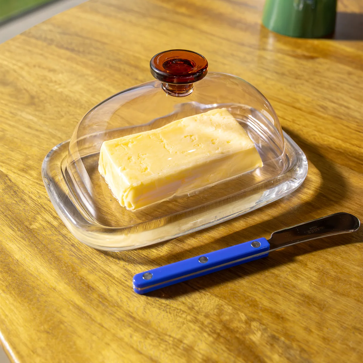 - Le couvercle en verre borosilicaté garde le beurre frais et visible