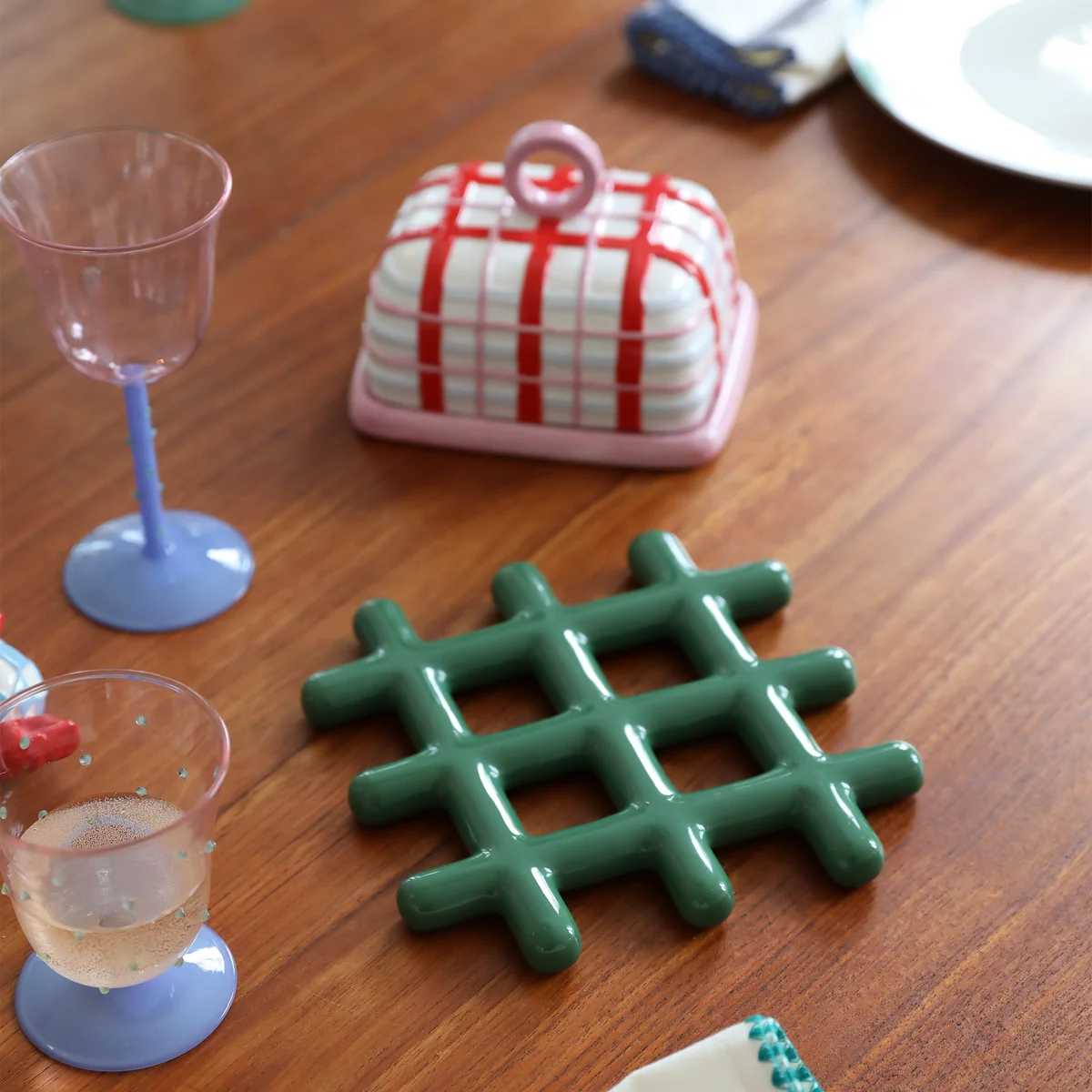 Le beurrier Plaid de & klevering confère à votre table à manger un look moderne et frais. Fabriqué en dolomite émaillée de haute qualité, ce beurrier se distingue par sa durabilité et son design élégant. Le motif graphique apporte une touche d'espièglerie et souligne l'individualité de la pièce. Le set est livré complet avec une petite assiette et un couvercle assorti qui permet de garder votre beurre toujours frais. Ce complément élégant élève vos repas quotidiens à un niveau supérieur et est disponible en deux couleurs attrayantes.