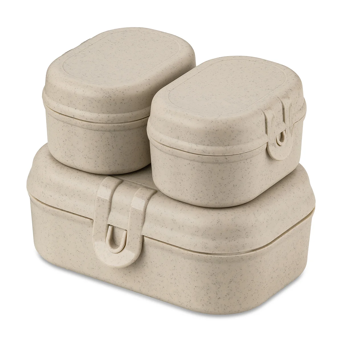 Koziol fabrique le set de boîtes à lunch avec couverts en matière thermoplastique avec cellulose. Ainsi, le set avec couverts est écologique, durable, réutilisable, adapté aux aliments, recyclable et garanti sans formaldéhyde ni BPA.