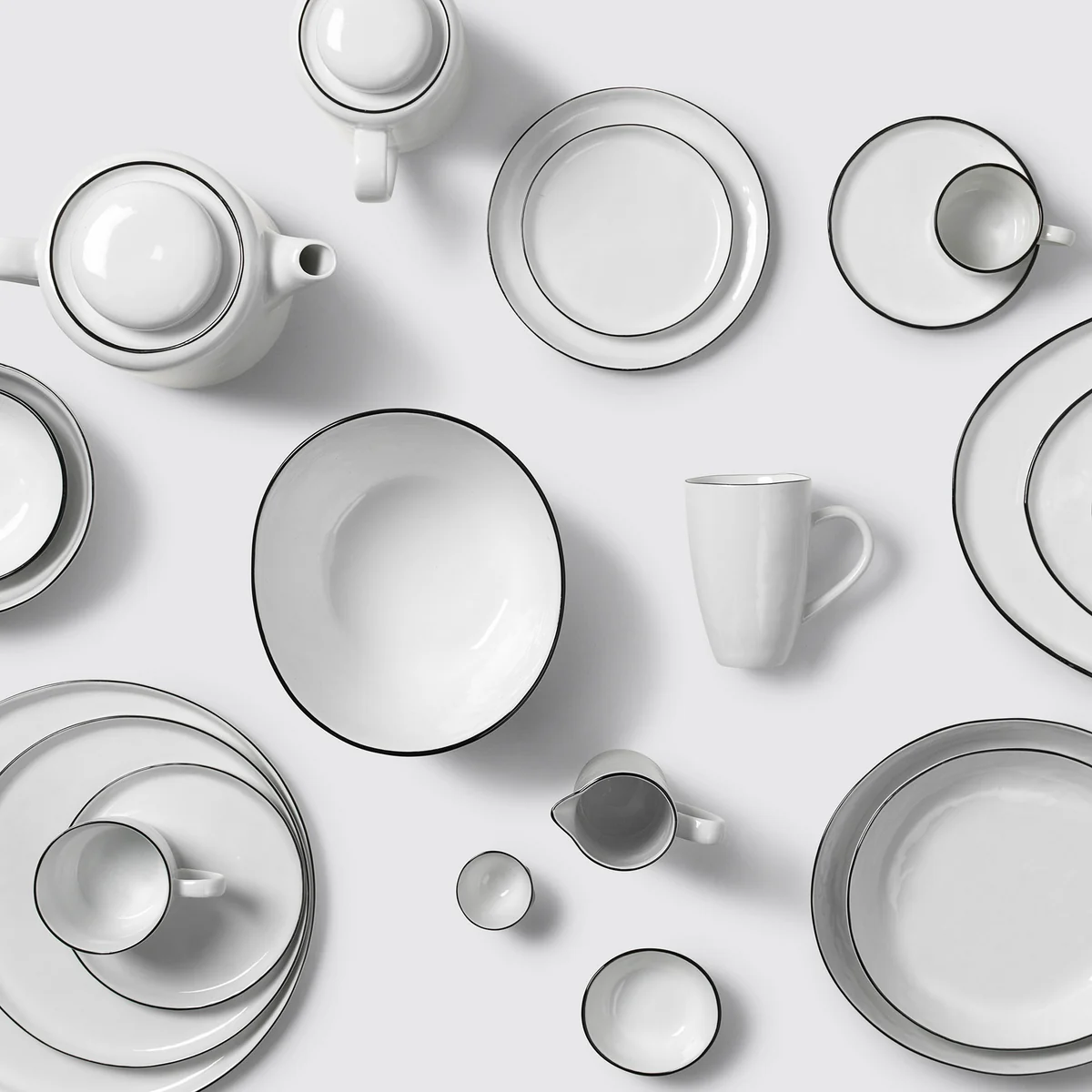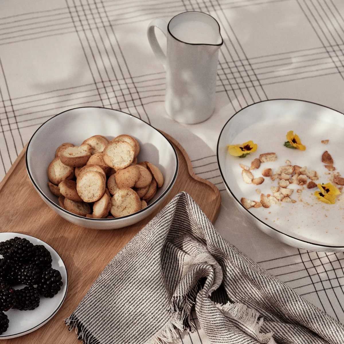 Dans le bol Salt bol de Broste Copenhagen , on peut déguster avec style les céréales du matin, une soupe chaude ou une salade fraîche. Le bol fait partie de la Salt collection et se caractérise par des formes classiques alliant élégance et netteté. L'émail blanc est complété par des bords noirs peints à la main. C'est au cours du processus de cuisson que l'émail acquiert sa texture et sa couleur distinctes, rendant chaque pièce de vaisselle unique.