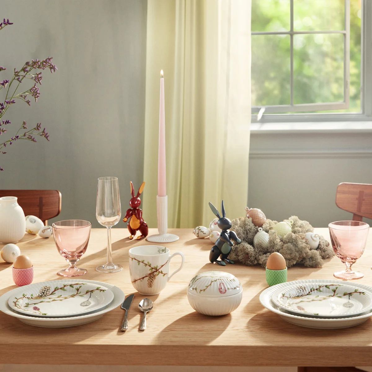 Les produits de la Hammershøi Pâques sont lavables au lave-vaisselle. Le design est repris sur les tasses, les bonbonnières et les articles décoratifs. Ils peuvent ainsi être combinés pour former un ensemble personnalisé.