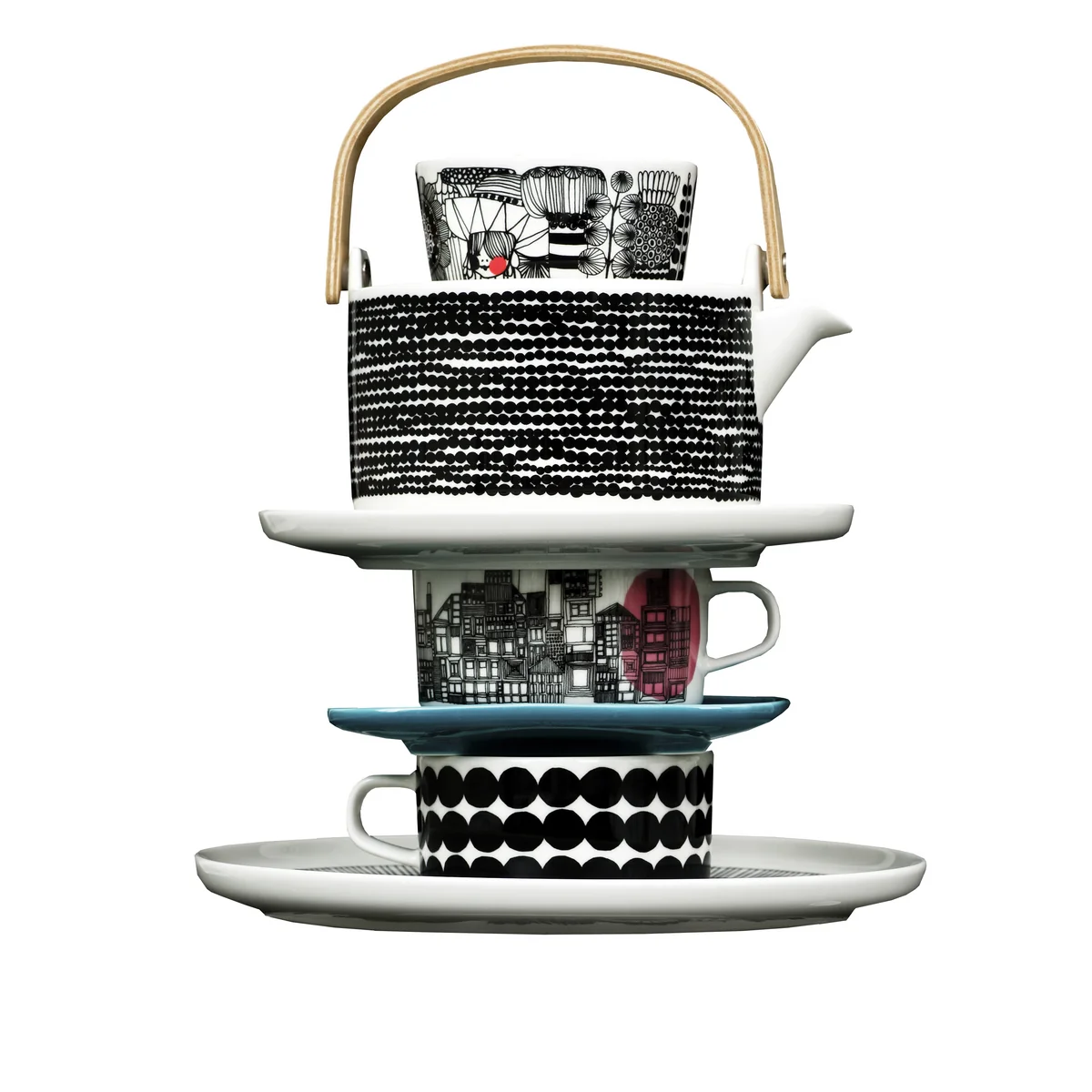 Siirtolapuutarha (fin. petit jardin) est le nom de la collection Marimekko , qui comprend des assiettes, des tasses et des bols au design charmant dans un noir et blanc sobre.