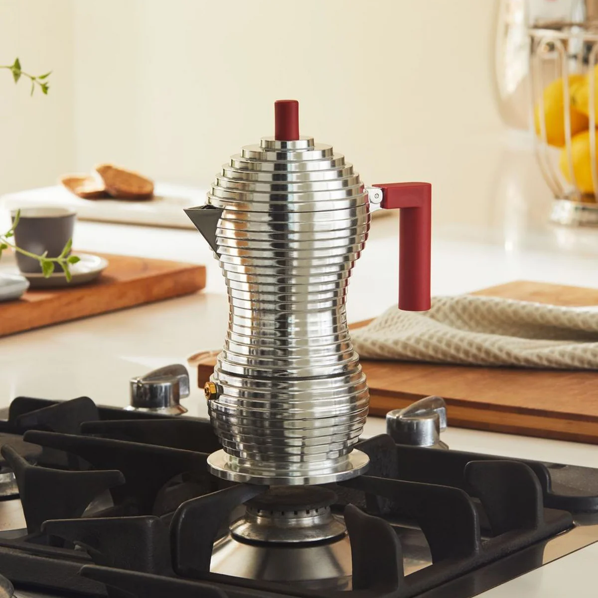 Le Pulcina La cafetière espresso de Michele De Lucchi pour Alessi est fabriquée en aluminium coulé et est disponible en différentes tailles et couleurs.