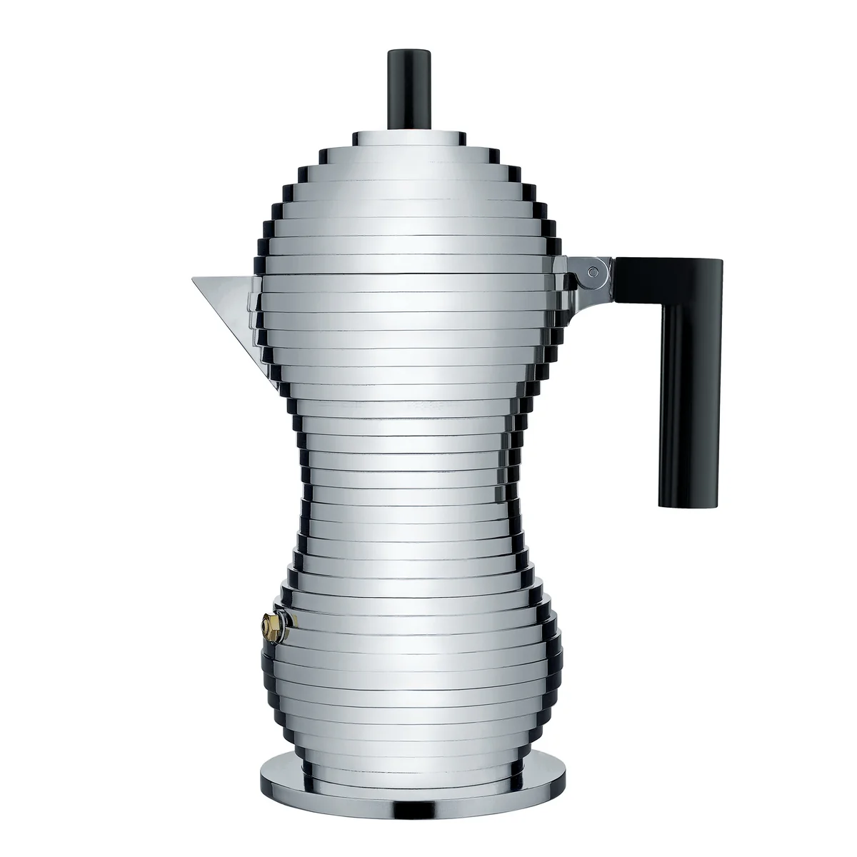 Le Pulcina La cafetière espresso de Michele De Lucchi pour Alessi est fabriquée en aluminium coulé et est disponible en différentes tailles et couleurs.
