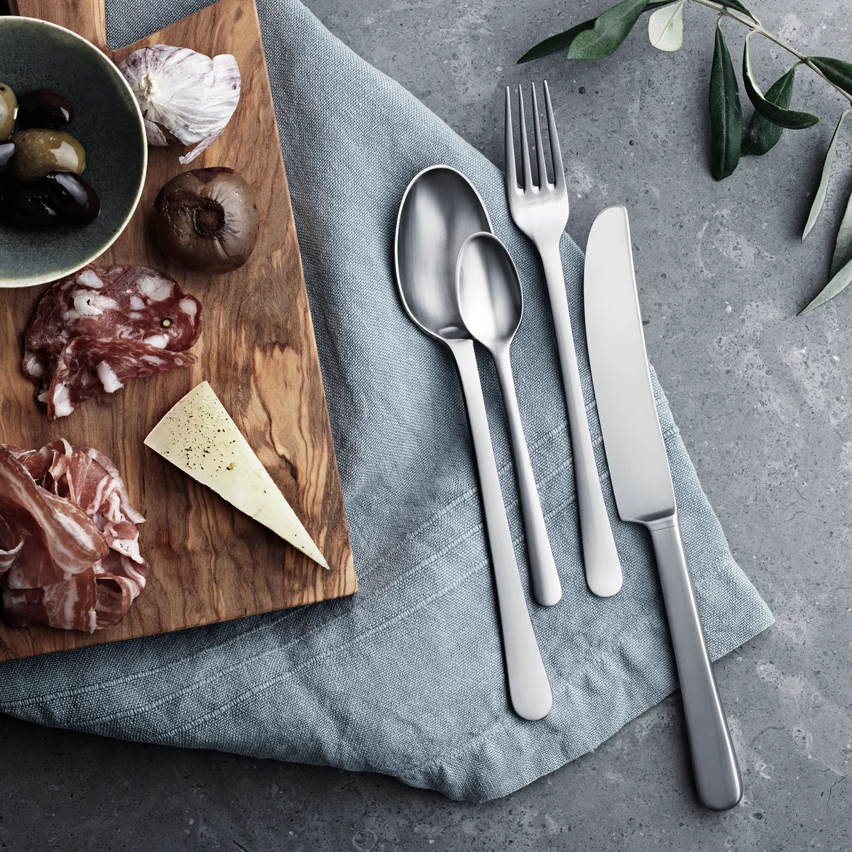 La gamme Copenhagen La série de couverts est fabriquée en acier inoxydable par Georg Jensen et est disponible en finition mate ou polie miroir.