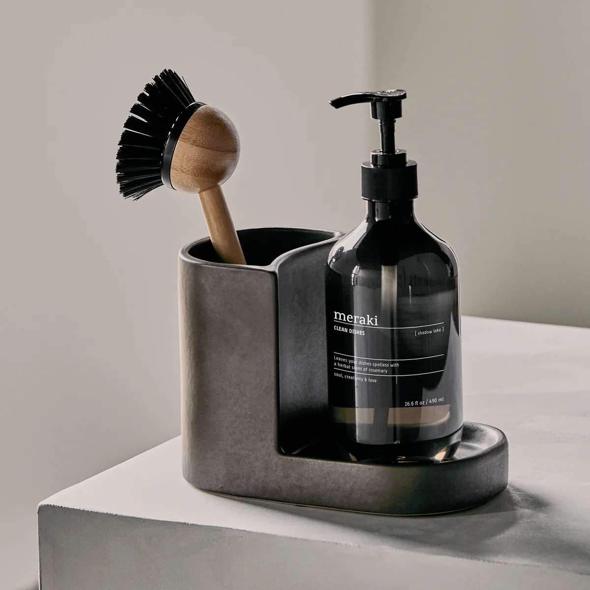 Avec le système de rangement minimaliste et intemporel Datura pour liquide vaisselle et brosse à vaisselle de Meraki , il est possible de créer un lieu de rangement attrayant. Au lieu de laisser les ustensiles de vaisselle en désordre sur le plan de travail de la cuisine, ils peuvent désormais être bien rangés. Cela facilite l'essuyage du plan de travail et permet d'obtenir une zone d'évier élégante et bien rangée. L'organisateur pour l'évier est en faïence et recouvert d'un discret émail gris, ce qui crée une atmosphère naturelle et calme dans la cuisine.