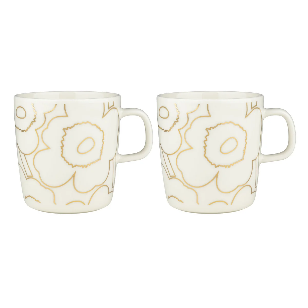 La tasse Oiva Piirto Unikko avec anse de Marimekko est fabriquée en faïence blanche et peut être utilisée au lave-vaisselle, au four, au micro-ondes et au congélateur.
