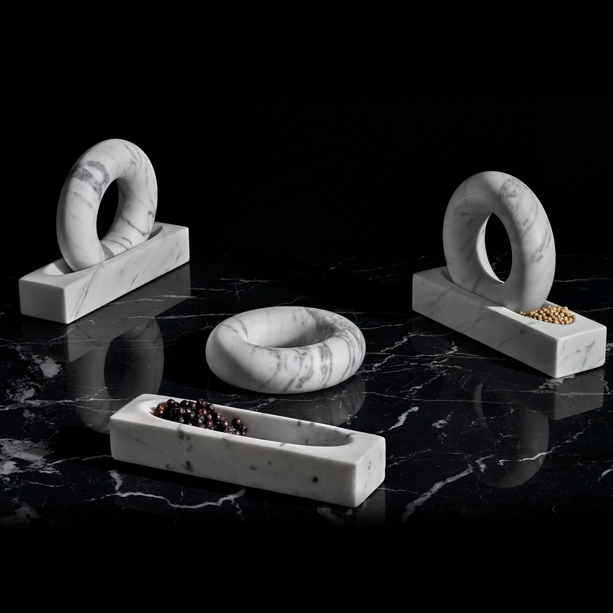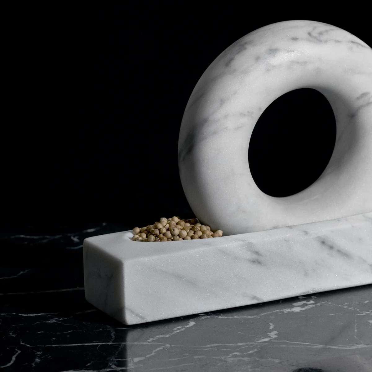 Tondo est à la fois sculpture et outil. Conçu exceptionnellement, le mortier est quand même très familier. Il se compose d’un anneau et d’un bol avec une encoche dans laquelle l’anneau s’intègre parfaitement. Les deux composants sont fabriqués en marbre massif haut de gamme. Le mortier permet de moudre finement des grains de poivre, des épices, du sel, des noix et beaucoup d’autres choses. Son anneau tient bien en main, ce qui permet que vous vous amusiez en moulant les petites choses.