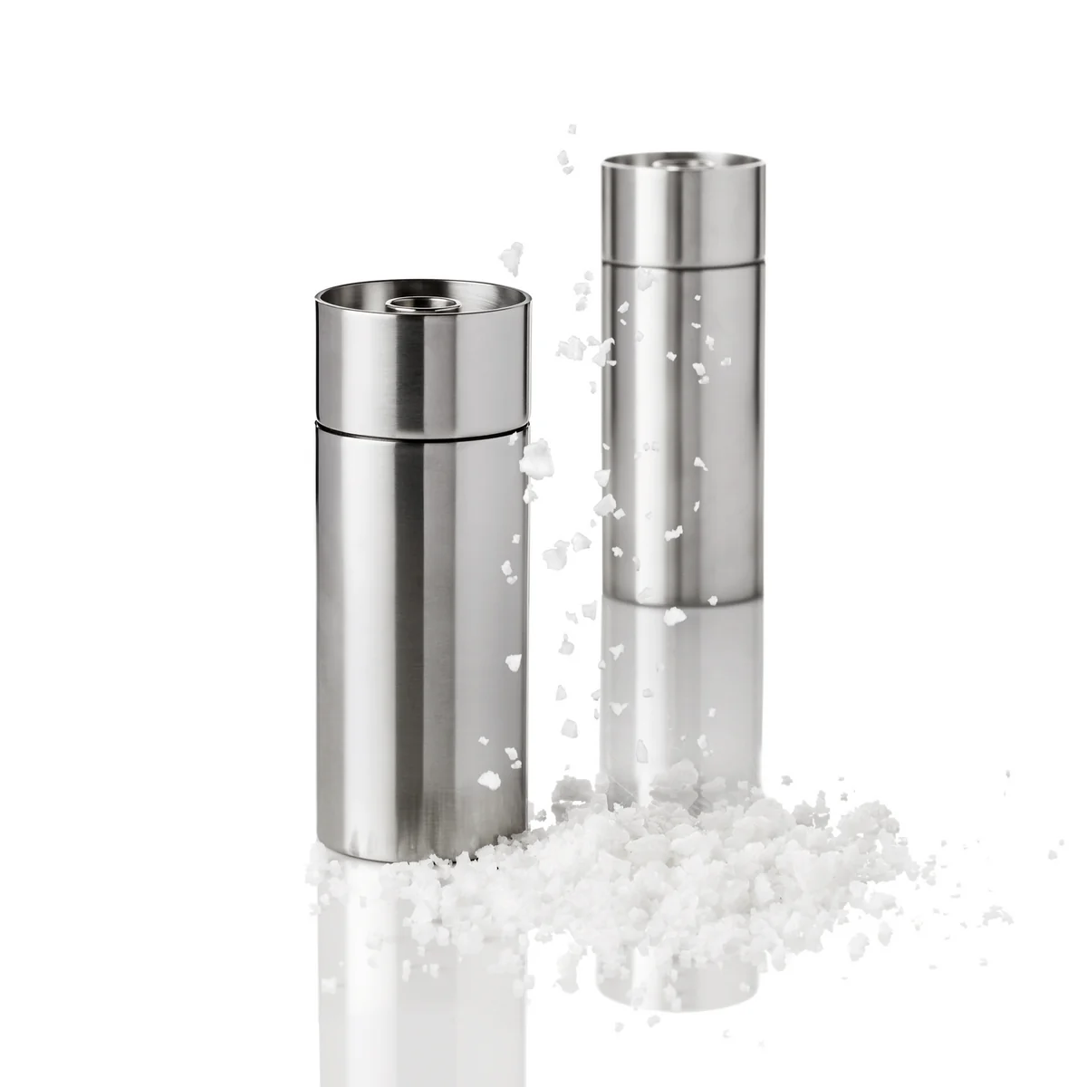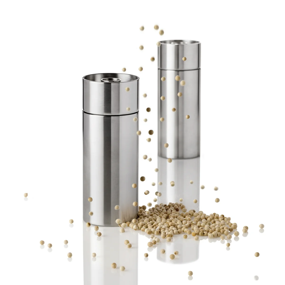 Les moulins à sel et à poivre de la série Cylinda de Stelton sont fabriqués en acier inoxydable poli mat. Avec le broyeur céramique, le matériau promet une longue durée de vie et beaucoup de plaisir pour le produit. Le moulin à poivre est marqué par un point noir sur la vis de blocage, le moulin à sel par un point blanc.