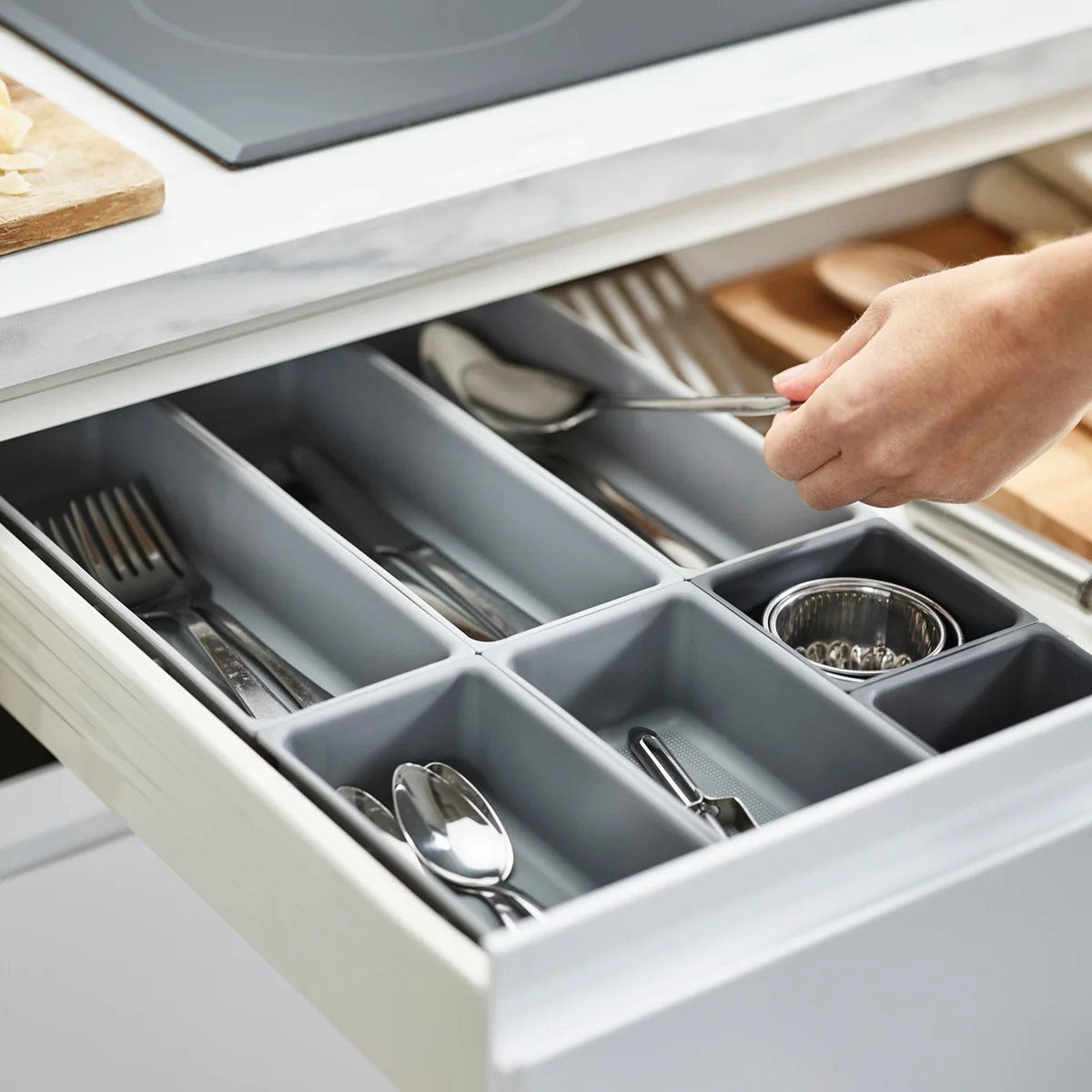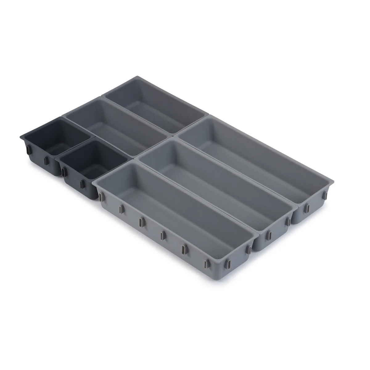 Le Blox Le set d'organisation des tiroirs de Joseph Joseph comprend des récipients individuels de différentes tailles qui peuvent être emboîtés tout autour et ainsi être disposés à volonté, en fonction de l'espace du tiroir. Bien entendu, les compartiments peuvent également être divisés et utilisés dans différents tiroirs.