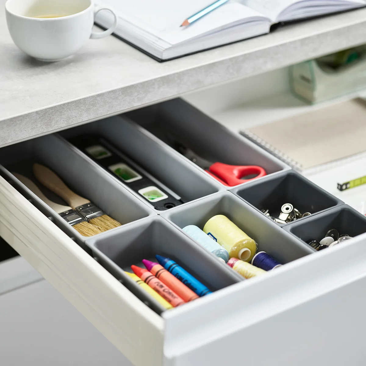 Blox est parfait pour le stockage organisé d'un large éventail d'articles ménagers tels que les couverts, les ustensiles, les fournitures de bureau, les outils ou les fournitures d'artisanat. Grâce au réglage individuel de la taille, l'ensemble peut être utilisé aussi bien sur le bureau que dans le tiroir de la cuisine ou sur l'établi.