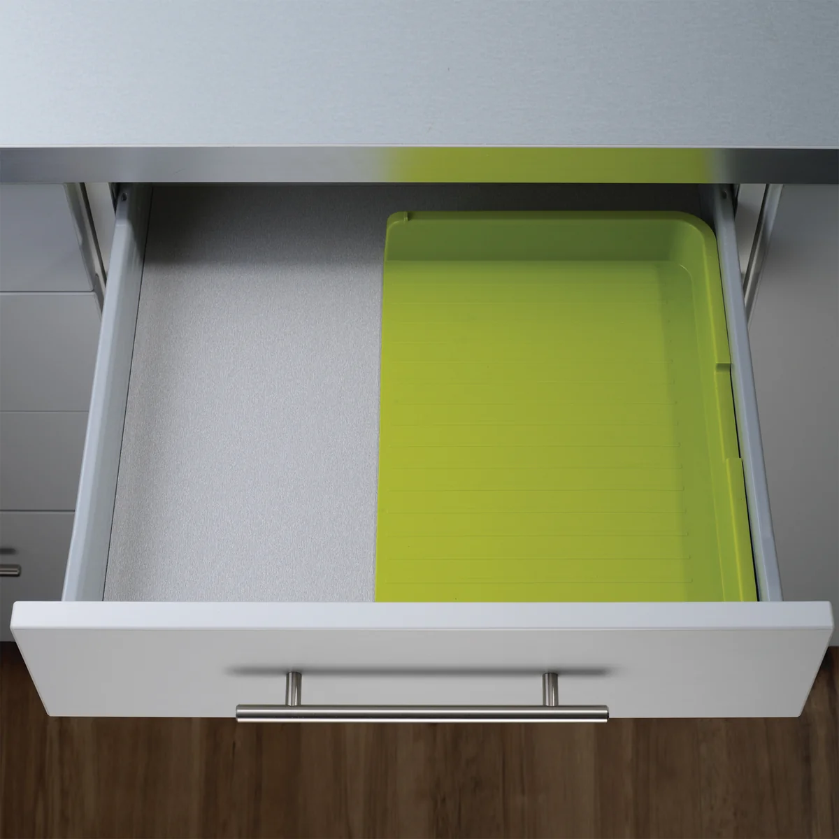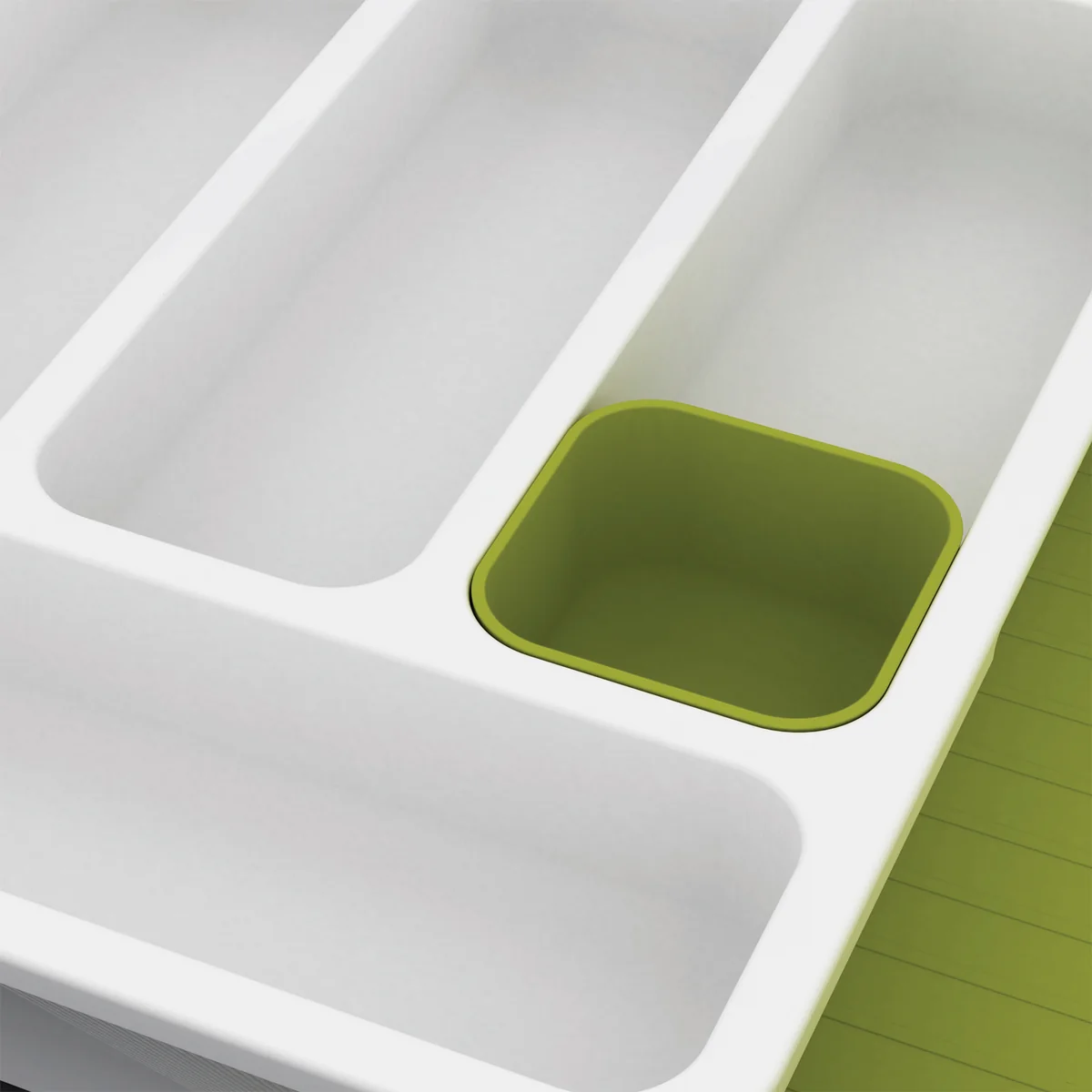 Les deux moitiés de l'aide de cuisine de Joseph Joseph peuvent être séparées pour s'adapter à différentes tailles de tiroirs. Une fois ajusté, l'insert du tiroir coulissant s'enclenche facilement et en toute sécurité. Quatre compartiments pour les couverts, un espace pour les gros objets comme les couteaux et les fouets, et un compartiment amovible pour les petits objets en vrac offrent un rangement fonctionnel.