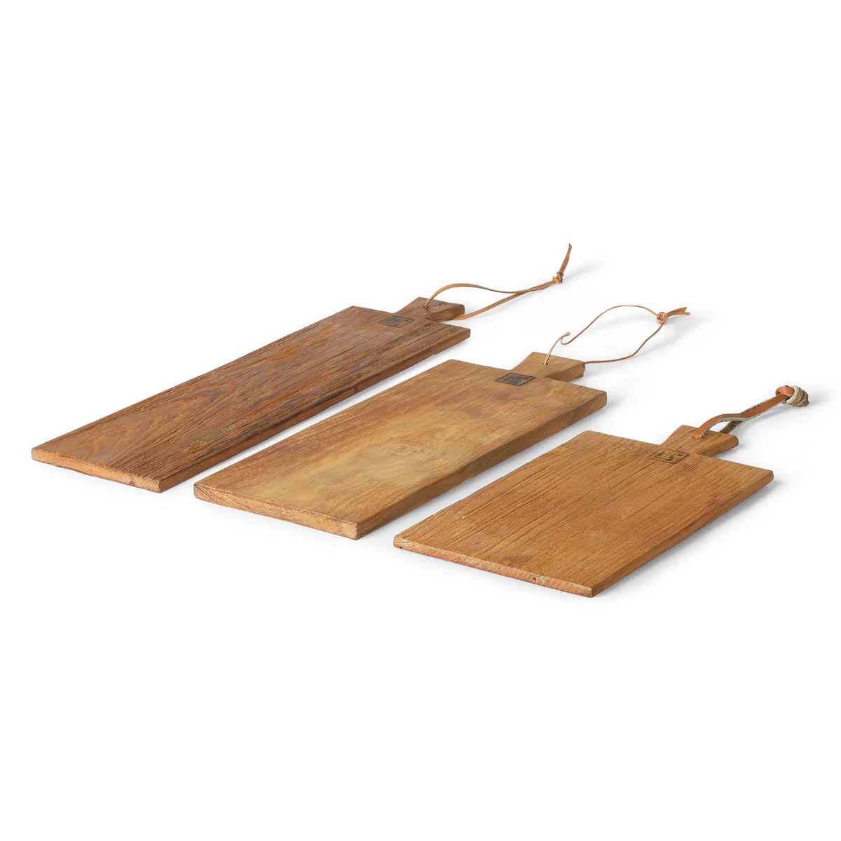 L'ensemble est fabriqué en teck et se compose de trois planches de service de tailles différentes avec une sangle en cuir pratique pour les suspendre.