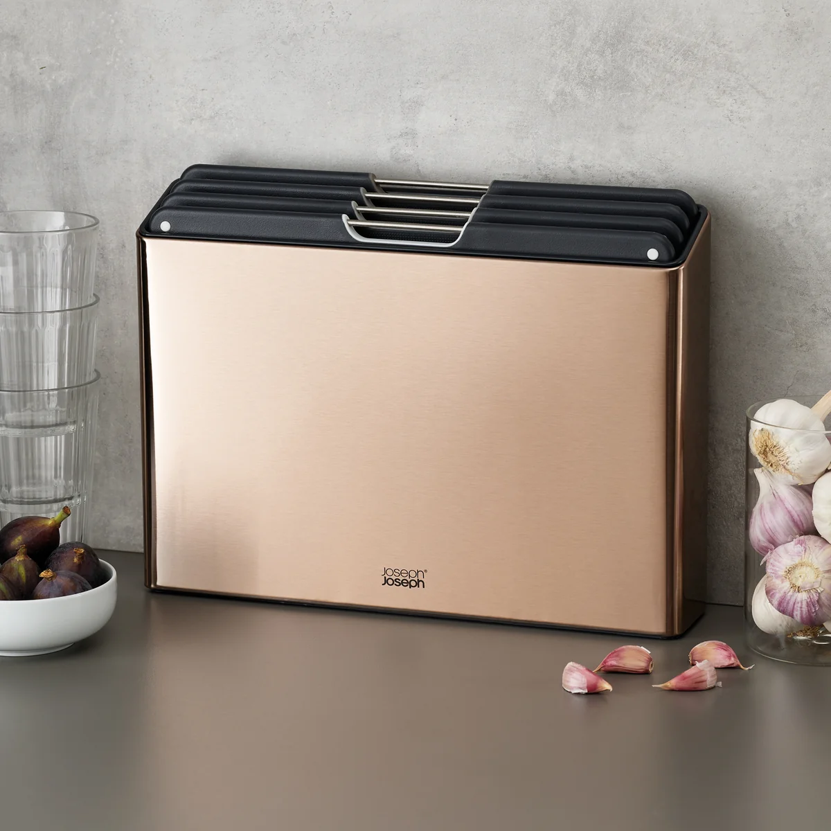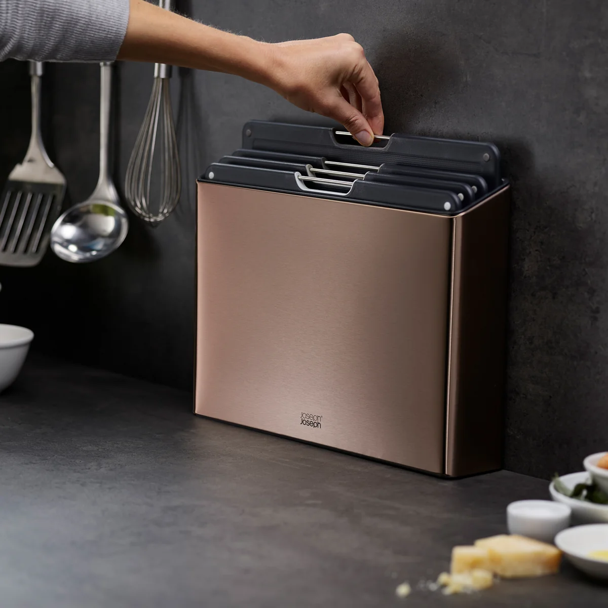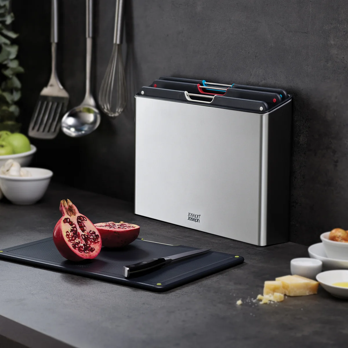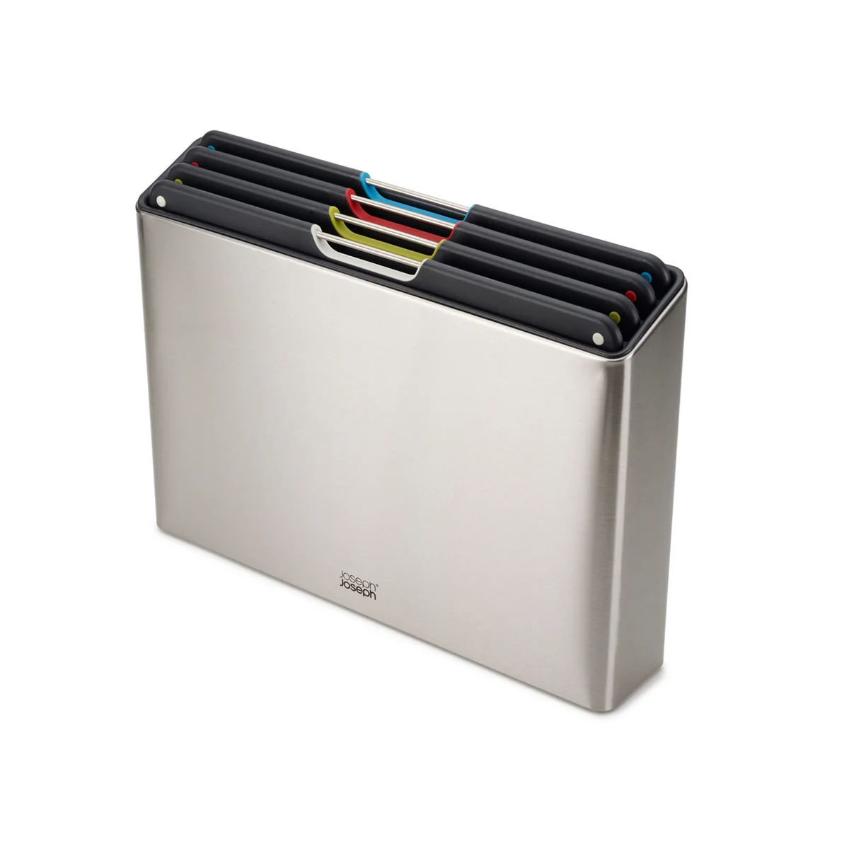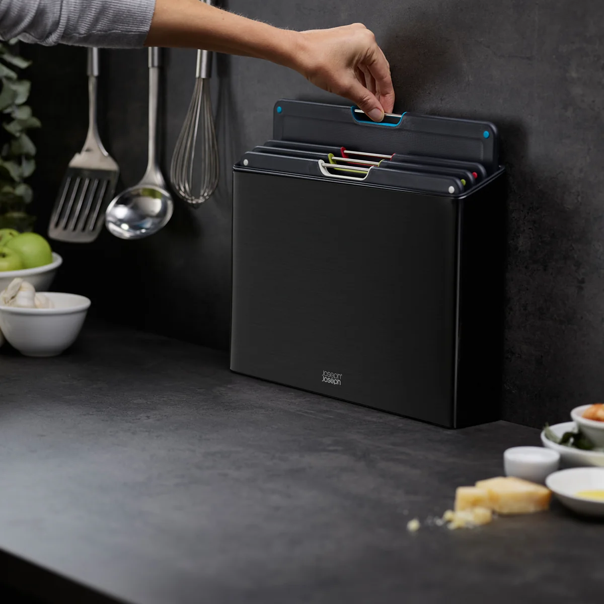Les planches à découper Folio Steel de Joseph Joseph aident à maintenir l'ordre dans la cuisine. Quatre planches à découper de couleurs différentes sont rangées dans un boîtier étroit en acier inoxydable et peuvent être facilement retirées grâce à une poignée.