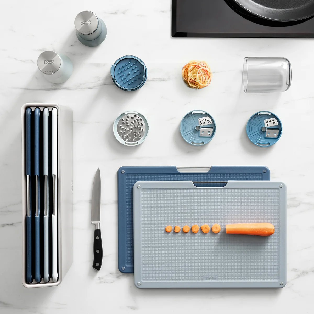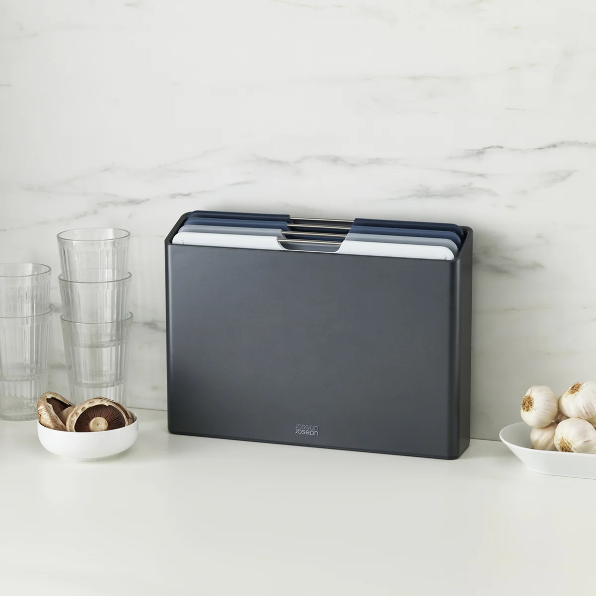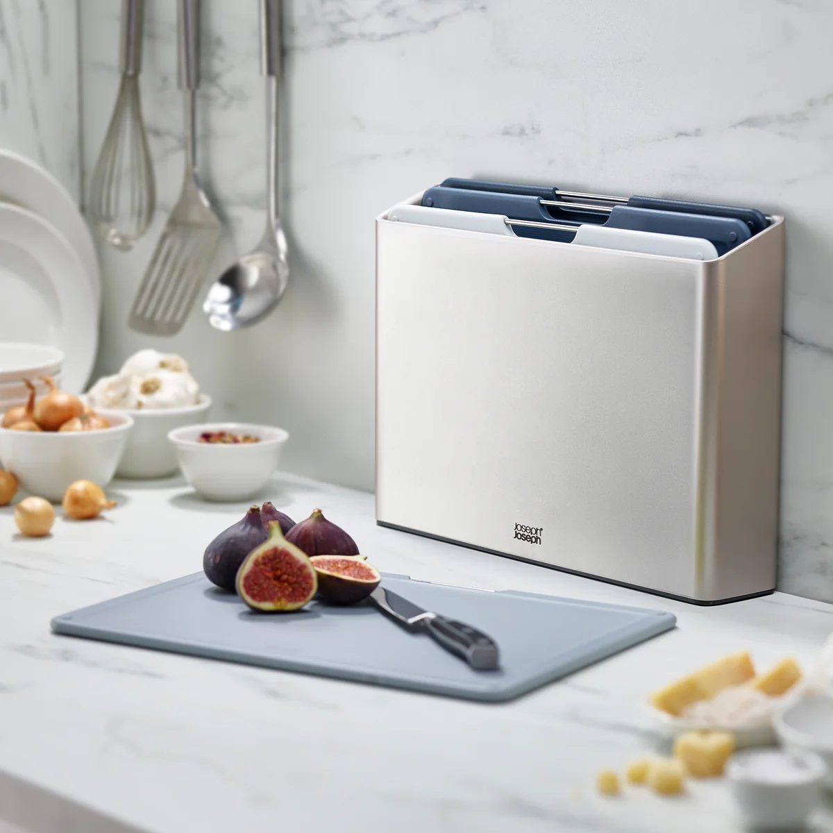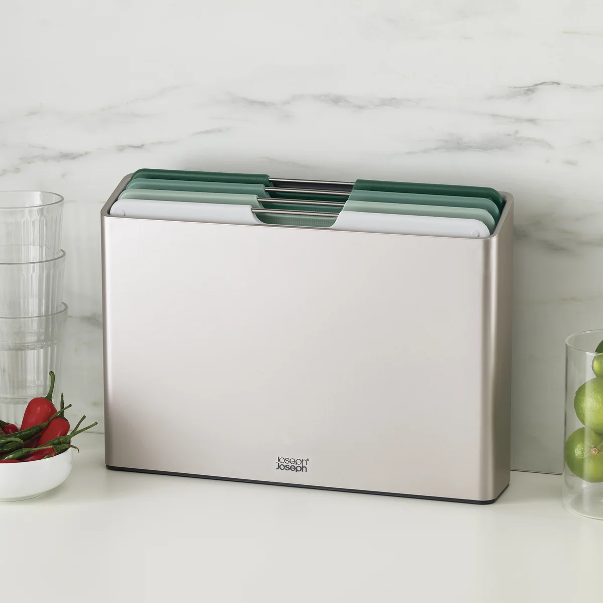 Les planches à découper Folio Steel de Joseph Joseph aident à maintenir l'ordre dans la cuisine. Quatre planches à découper de couleurs différentes sont rangées dans un boîtier étroit en acier inoxydable et peuvent être facilement retirées grâce à une poignée.