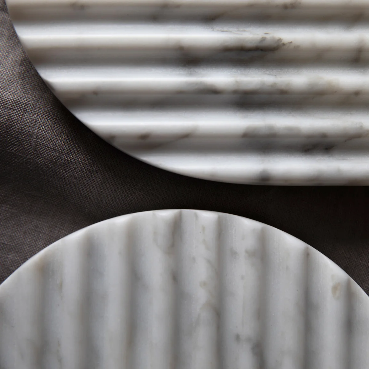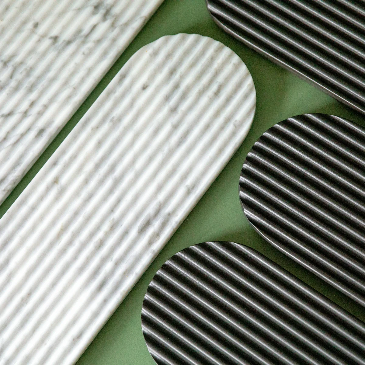 Le Podium planche à servir de Northern se distingue par sa forme ovale et allongée et sa surface striée. Fabriquée en marbre massif ou en pierre, la planche de service convient bien comme support pour la théière.