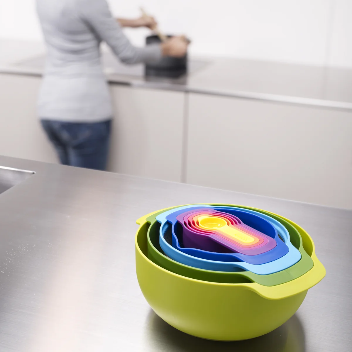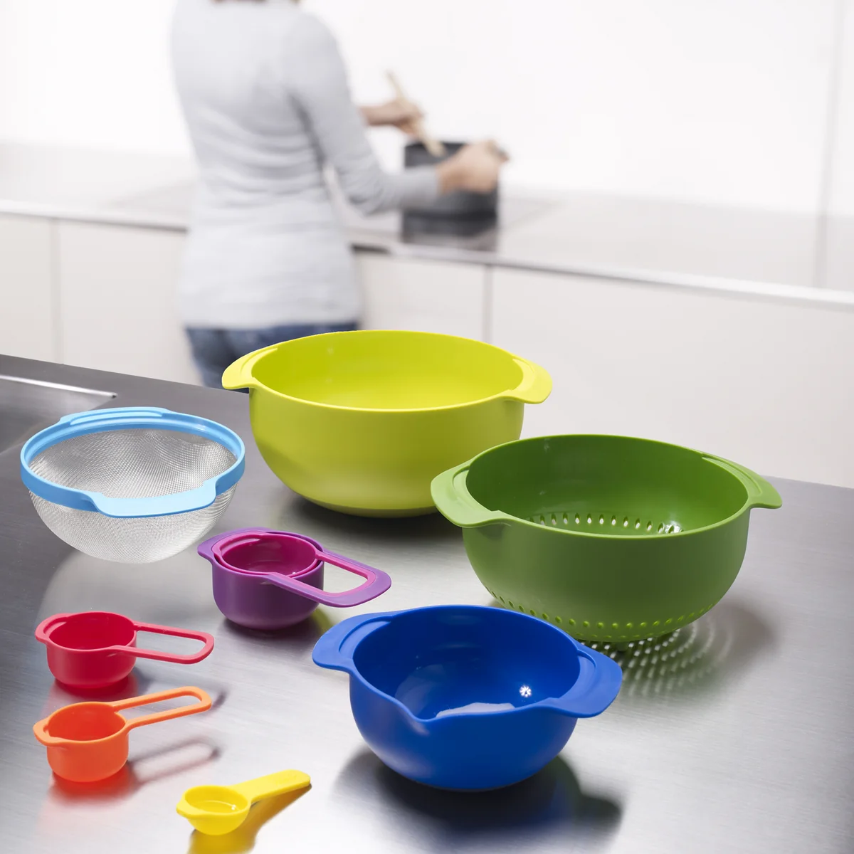 Nest 9 Plus de Joseph Joseph est la combinaison ultime d'ustensiles de cuisine. Avec cinq verres doseurs, deux saladiers, un tamis filtrant et une passoire, plus aucune recette ne vous posera problème.