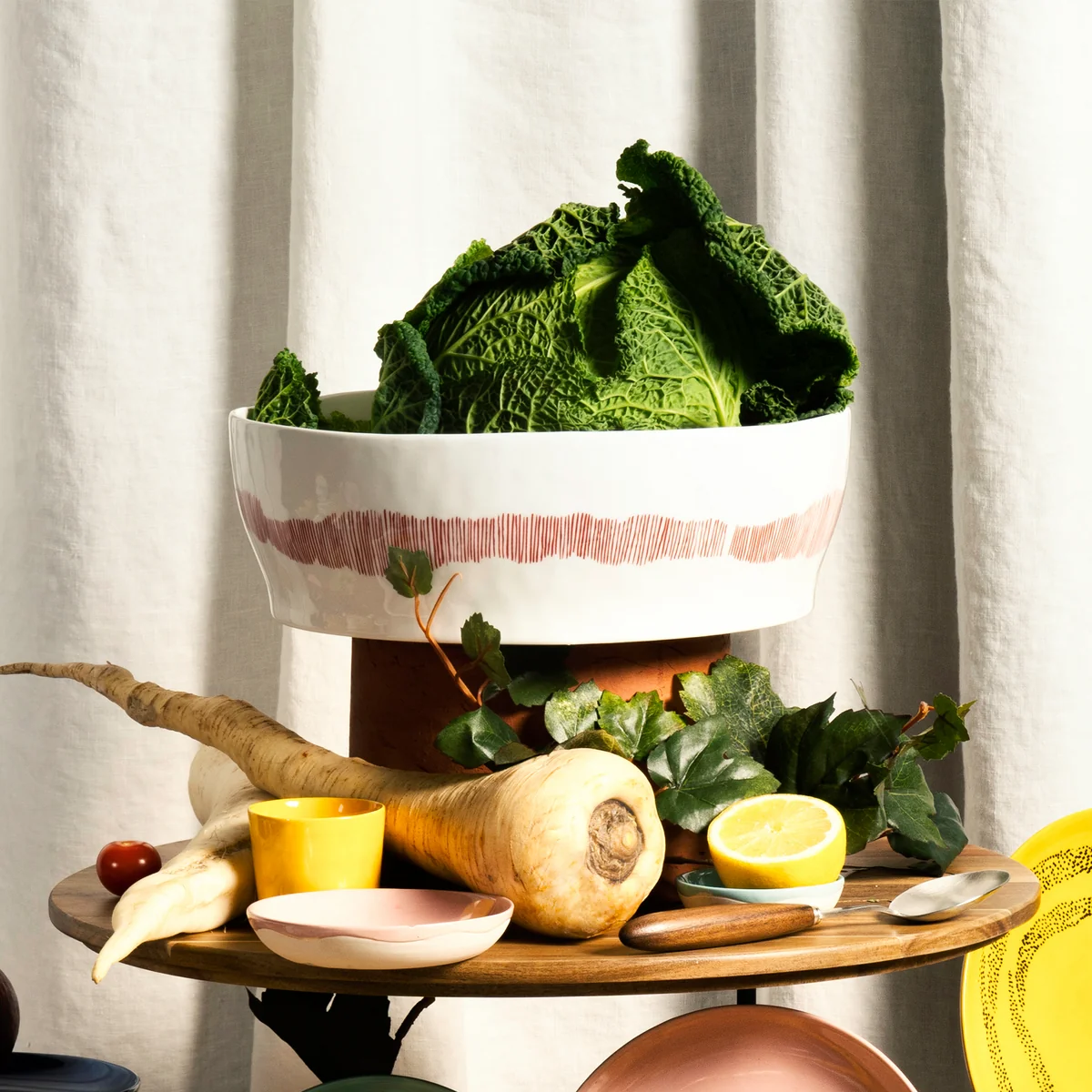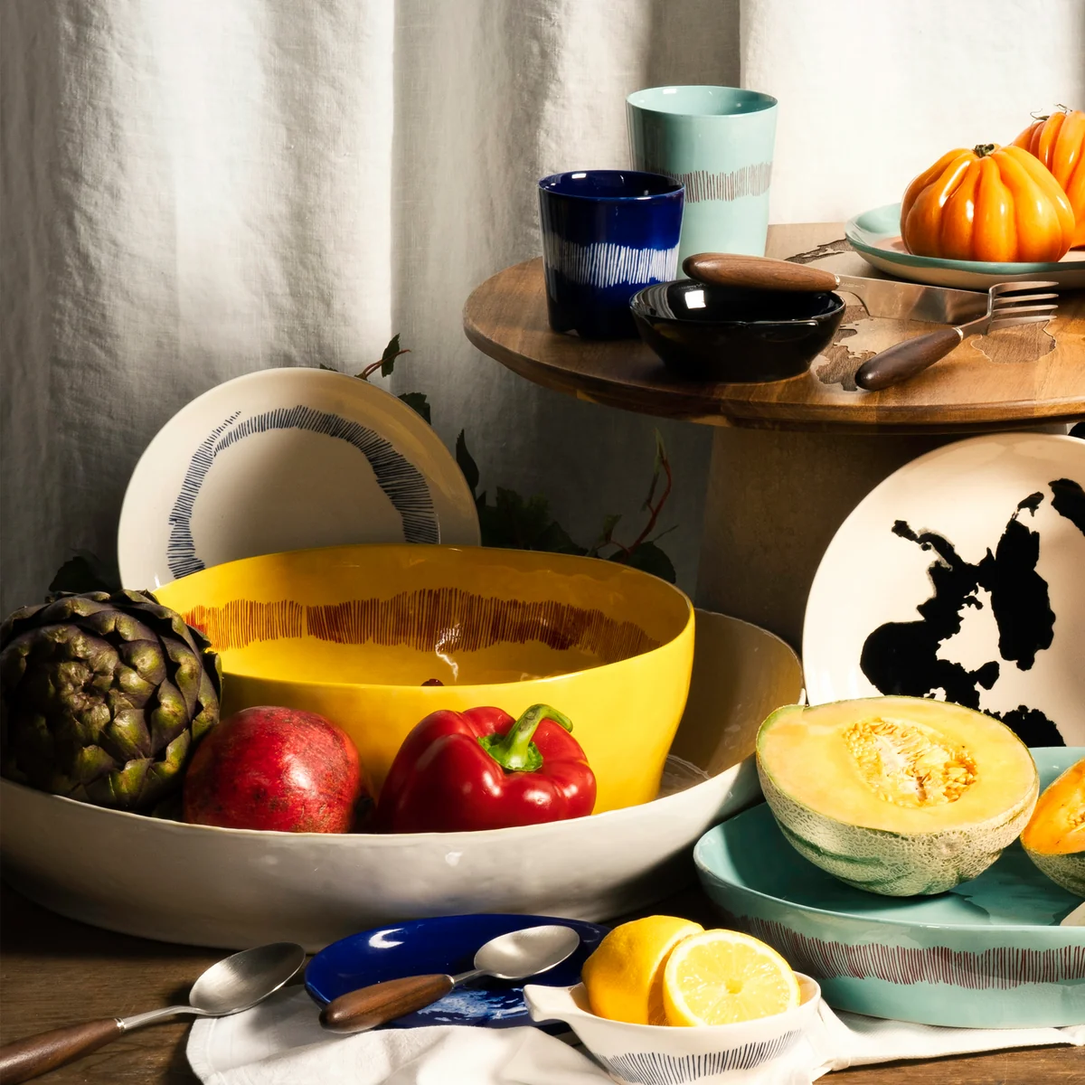Ce saladier émaillé apporte une touche de couleur fraîche et de joie de vivre méditerranéenne sur la table. Faisant partie de la collection Feast de Yotam Ottolenghi, elle se distingue par ses couleurs expressives et son matériau céramique de haute qualité. Chaque bol est une pièce unique affinée à la main, ce qui peut entraîner de petites irrégularités - un signe de travail manuel authentique et une partie du caractère particulier de la collection.