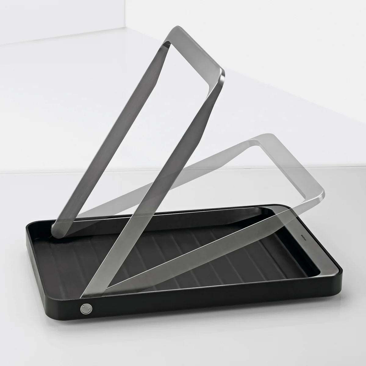 Stelton s new " Take away "Le plateau de service est une aide pratique dans la vie de tous les jours, par exemple pour transporter la vaisselle en toute sécurité de la cuisine au salon - ou au pique-nique à l'extérieur. Il offre une poignée stable, ergonomique et rétractable avec un rembourrage en mousse et se trouve normalement presque invisiblement caché dans le cadre. Le plateau est équipé d'un tampon en silicone qui empêche tout glissement involontaire lors du transport et peut également être retiré pour le nettoyage.