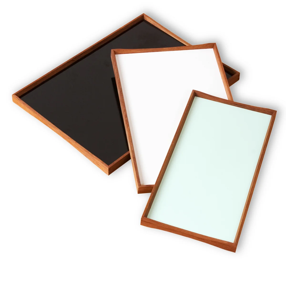 Diverses marques de fabrique de l'ancien maître se retrouvent également dans le Turning Tray : cela vaut aussi bien pour le cadre en teck courbé que pour les raccords d'angle caractéristiques du plateau. Si vous souhaitez admirer les plateaux originaux de Juhl, nous vous recommandons de vous rendre dans sa maison de Charlottenlund, qui fait aujourd'hui office de musée.