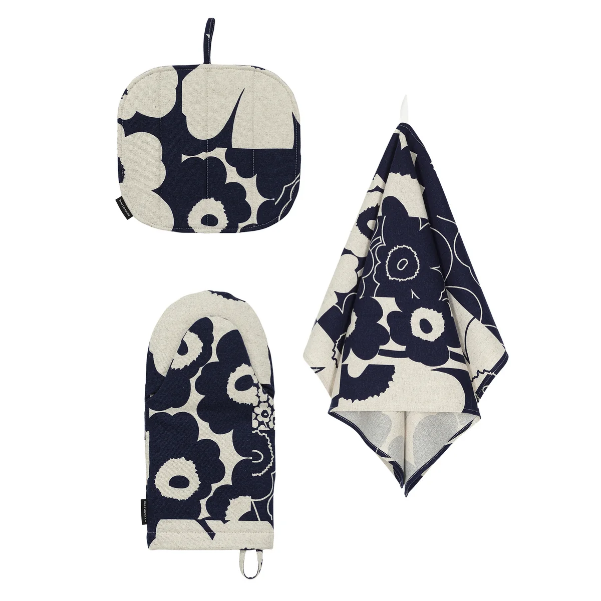 Marimekko - Unikko Kollaasi set de cuisine, torchon & gant de four & maniques, lin / dark navy (set de 3) (60th Anniversary Collection)