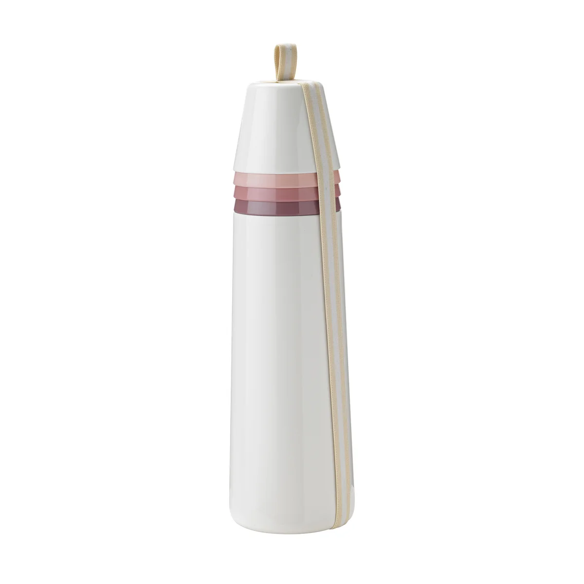 La bouteille isolante est livrée avec 4 gobelets de différentes couleurs. Les gobelets sont fabriqués en plastique PBT solide. Idéal pour les familles avec de jeunes enfants. La bouteille isotherme est munie d'un élastique qui maintient les pièces ensemble lorsqu'elles ne sont pas utilisées ou lorsqu'elles sont placées dans la voiture ou dans le panier du vélo.