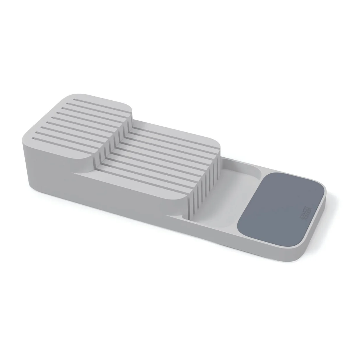 Avec l'aide à la commande de couteaux DrawerStore de Joseph Joseph , les couteaux tranchants peuvent être rangés tout simplement dans le tiroir de la cuisine. Ce type de stockage des couteaux présente plusieurs avantages : D'une part, le système d'organisation protège les couteaux, qui ne sont plus déstructurés et mal fixés dans le tiroir, et d'autre part, il constitue une solution peu encombrante qui permet d'accueillir jusqu'à neuf couteaux dans un espace très réduit.