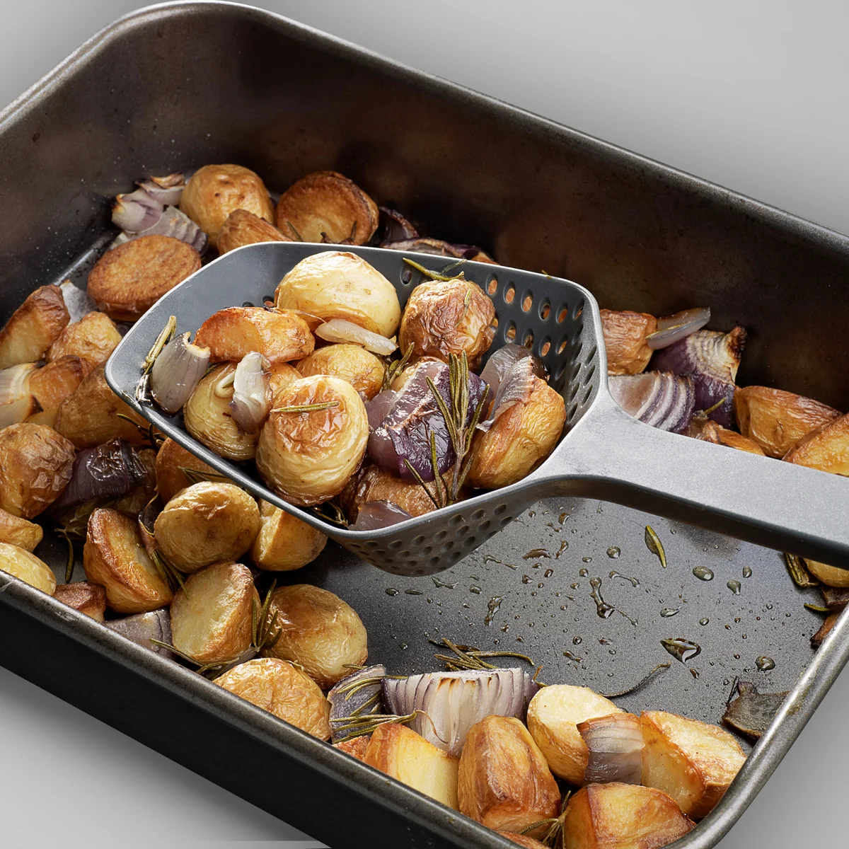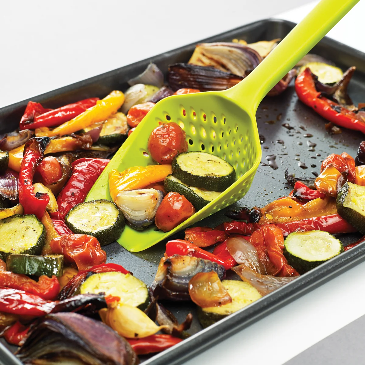 Scoop Plus de Joseph Joseph permet de retirer les aliments d'une poêle, casserole ou plat au four et de les égoutter, rapidement et efficacement.