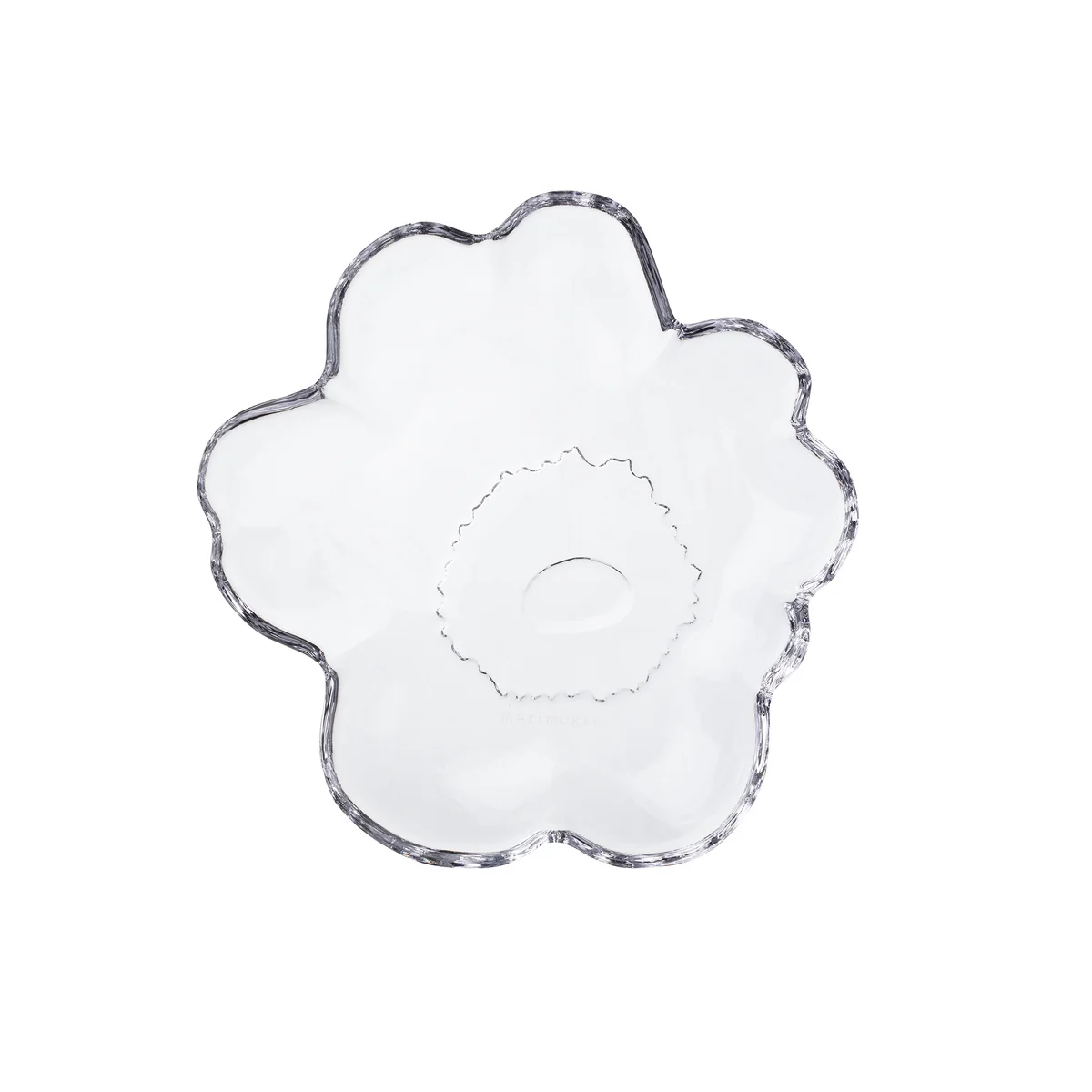 L'assiette en verre Unikko en forme de fleur de Marimekko . Il est recommandé de laver cette assiette à la main afin de préserver son design unique. Elle peut être lavée au lave-vaisselle, mais avec précaution, car le design prononcé peut être endommagé si elle entre en contact avec d'autres ustensiles.