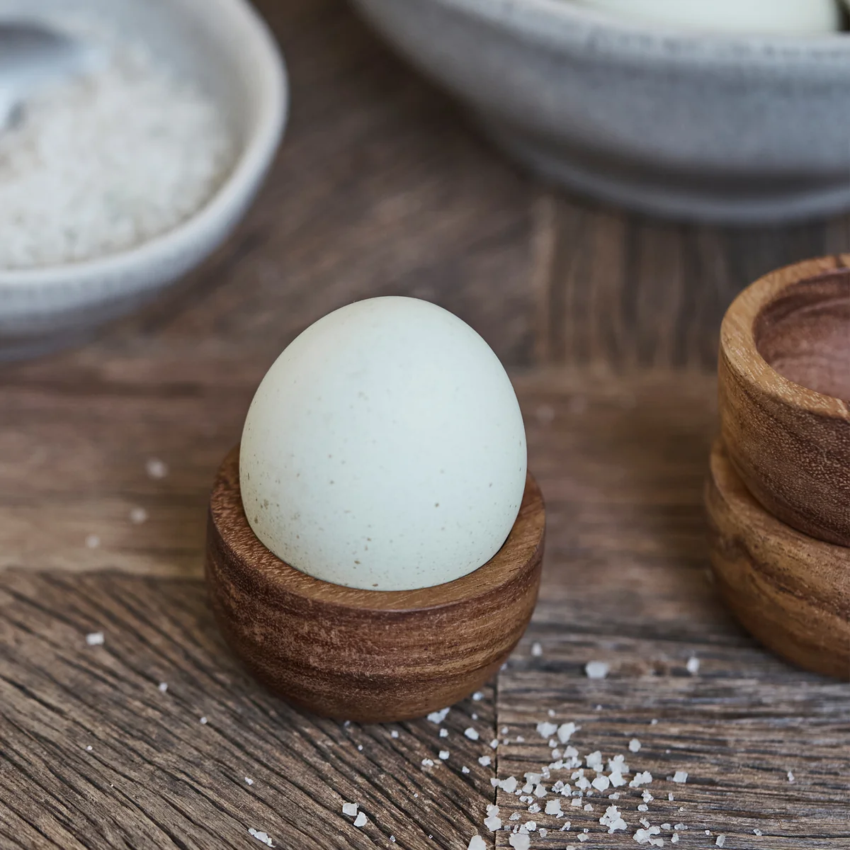 Ces coquetiers élégants en bois d'acacia allient un design minimaliste à un rayonnement chaleureux et naturel. Ils s'intègrent harmonieusement dans toutes les ambiances de table et apportent une touche de charme rustique au quotidien. Grâce à leurs multiples possibilités d'utilisation, ils conviennent non seulement comme coquetiers classiques, mais aussi comme petits récipients pour le sel, le poivre ou d'autres épices.