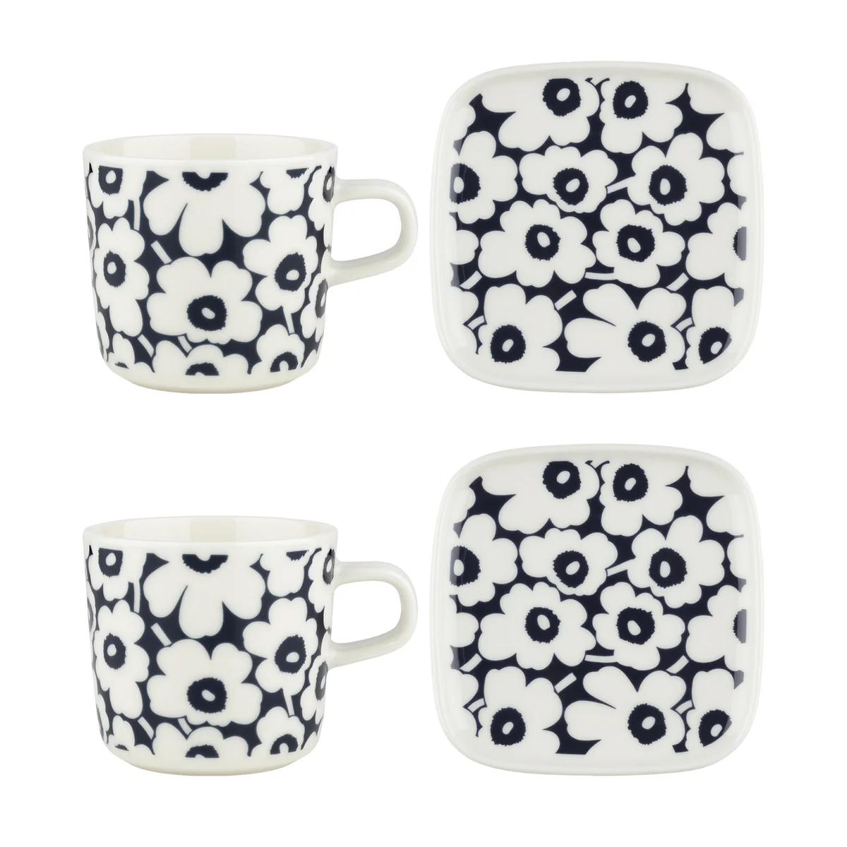 Oiva Pikkuinen Unikko Gobelet avec anse & Assiette de la maison Marimekko . Le set est fabriqué en faïence blanche et convient donc au lave-vaisselle, au four, au micro-ondes et au congélateur.