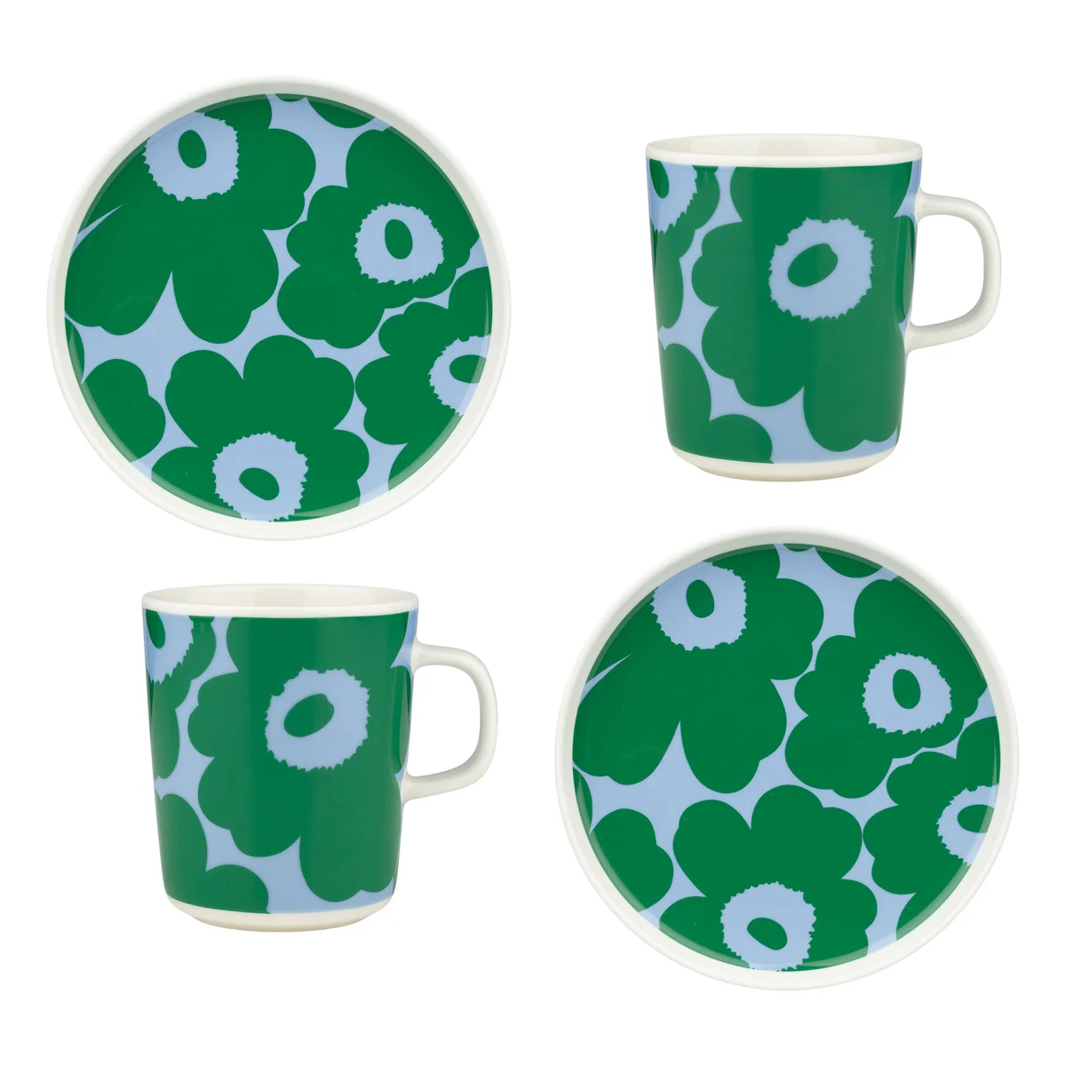 Le set de table comprend deux tasses (2,5 dl), deux assiettes creuses (20,5 cm) et deux assiettes plates (25 cm) - idéal pour les soirées conviviales ou les occasions spéciales. Le set petit-déjeuner contient deux grandes tasses (4 dl) et deux assiettes (20 cm), parfaites pour commencer la journée. Les deux sets sont emballés dans une élégante boîte avec le logo Marimekko et conviennent aussi parfaitement comme cadeau.