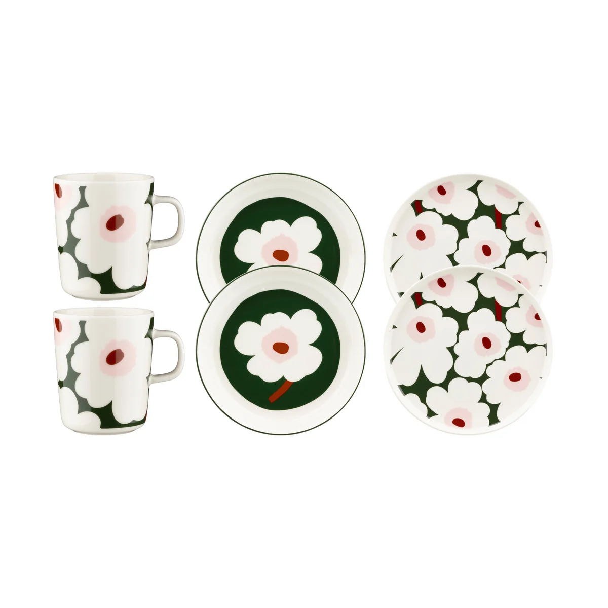 Le set de table comprend deux tasses (2,5 dl), deux assiettes creuses (20,5 cm) et deux assiettes plates (25 cm) - idéal pour les soirées conviviales ou les occasions spéciales. Le set petit-déjeuner contient deux grandes tasses (4 dl) et deux assiettes (20 cm), parfaites pour commencer la journée. Les deux sets sont emballés dans une élégante boîte avec le logo Marimekko et conviennent aussi parfaitement comme cadeau.