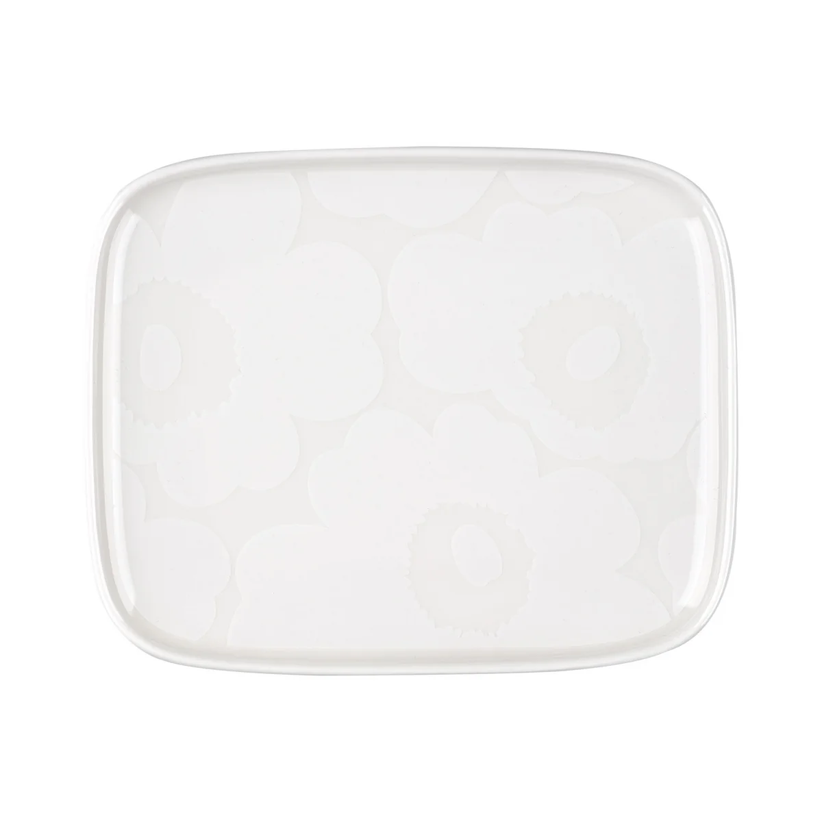 Le plateau rectangulaire de Marimekko est fabriqué en faïence blanche qui convient au lave-vaisselle, au four, au micro-ondes et au congélateur.