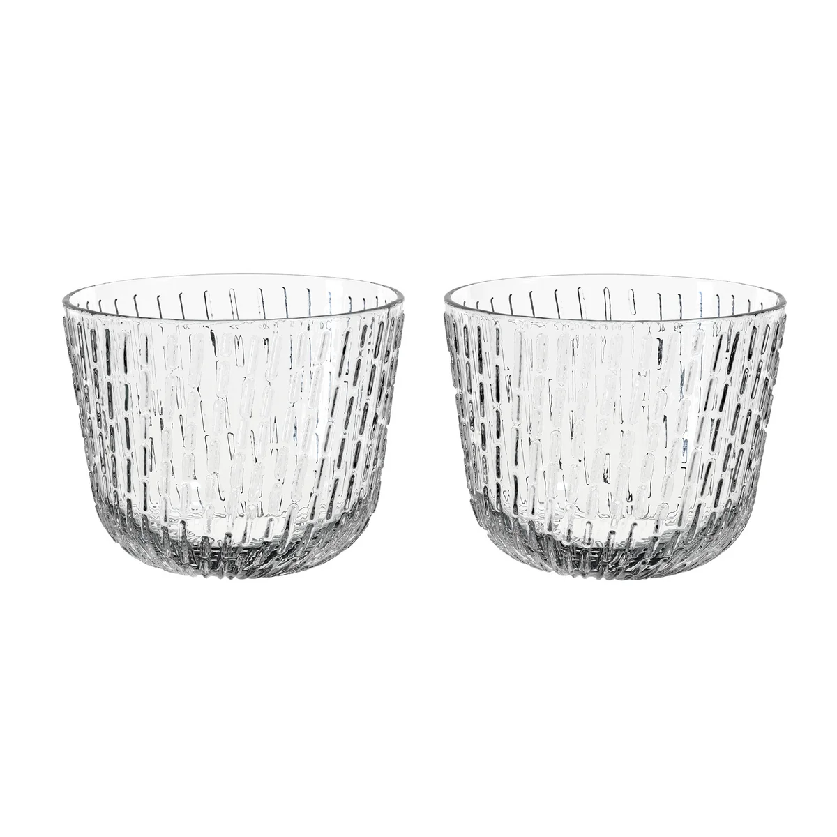 Le Syksy verre à boire de Marimekko est fabriqué en verre soufflé à la bouche. La série Syksy (Automne) série de verres, conçue par Matti Klenell, poursuit l'exploration de la nature et des phénomènes météorologiques, familiers dans l'art de l'impression de Marimekko . Le thème général de la nouvelle série est celui des formes de la pluie d'automne, d'un doux bruissement à des averses puissantes et pénétrantes.