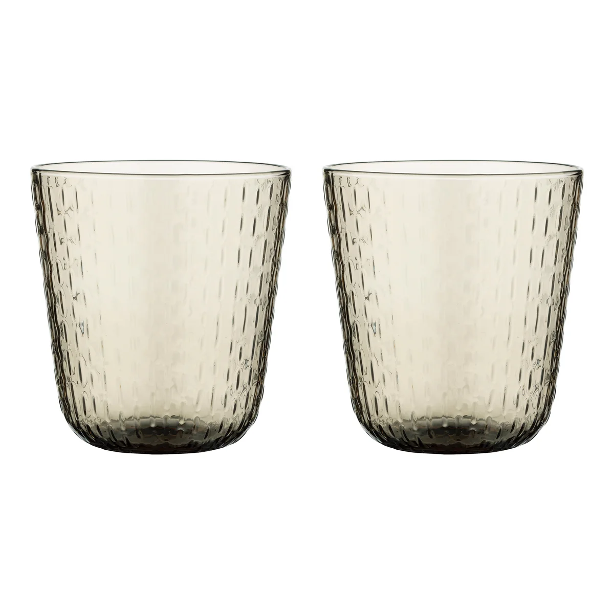 Le Syksy verre à boire de Marimekko est fabriqué en verre soufflé à la bouche. La série Syksy (Automne) série de verres, conçue par Matti Klenell, poursuit l'exploration de la nature et des phénomènes météorologiques, familiers dans l'art de l'impression de Marimekko . Le thème général de la nouvelle série est celui des formes de la pluie d'automne, d'un doux bruissement à des averses puissantes et pénétrantes.