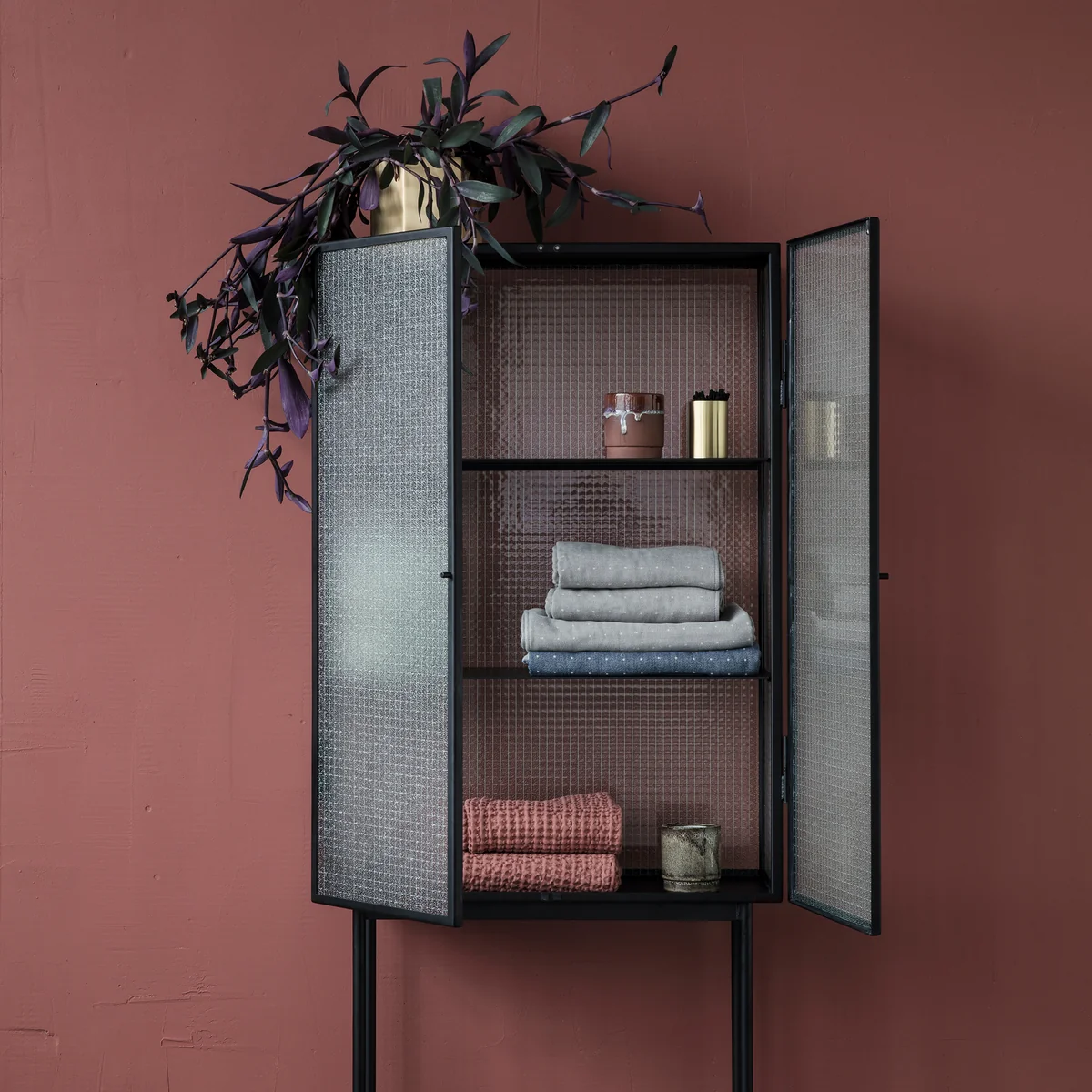 Les opposés s'attirent dans la vitrine Haze de Says Who pour Ferm Living. La vitrine en verre armé semi-transparent avec un cadre à quatre pieds en métal thermolaqué se ferme sans problème grâce aux aimants et rend le verre armé à nouveau présentable.