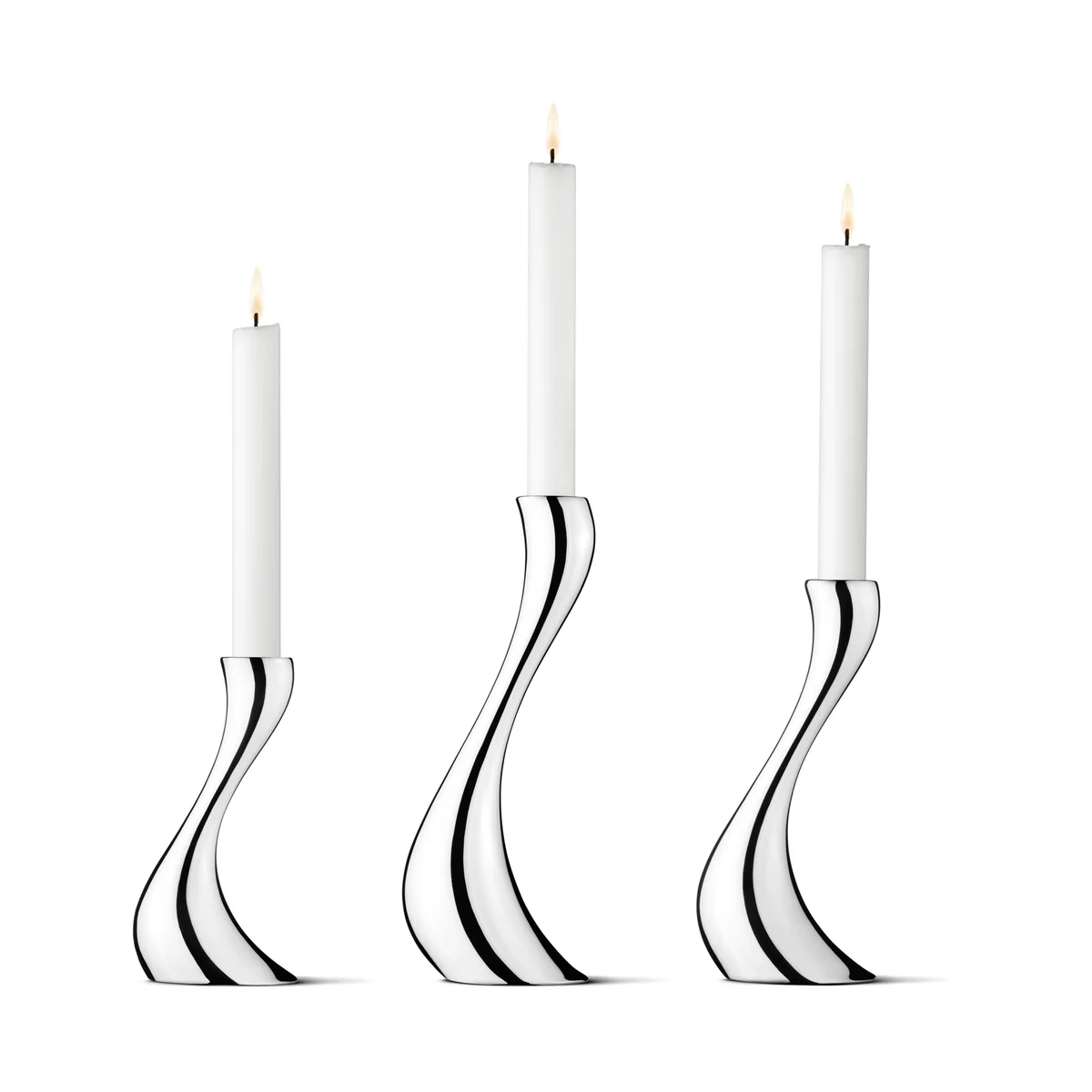 Quand les bougeoirs se pressent l´un à l´autre il se forme divers transformations » L´acier affiné brillant du bougeoir Cobra est réveillé par la vacillement des bougies, qui sont sécurisées dans le chandelier. Un seul bougeoir donne une déclaration audacieuse et originale. Avec différentes tailles et ensembles, des arrangements peuvent être créés par humour subtil, qui jouent un rôle clé dans tout l'ameublement. Le bougeoir Cobra est également disponible en version trois bras.