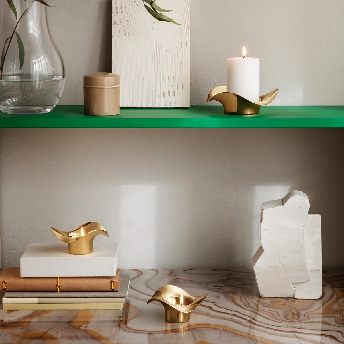Les bougeoirs pour bougies à chauffe-plat peuvent être disposés individuellement sur la table ou sur la commode dans le salon et allient des lignes harmonieuses à la chaleur de la lueur des bougies.