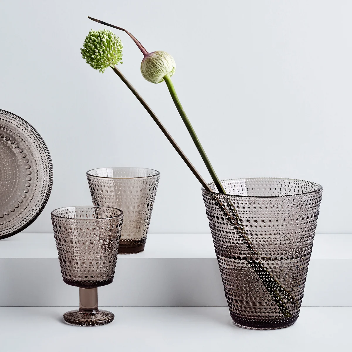 Le design Kastehelmi fut déjà influencé en 1964 par le designer de verrerie finlandais Oiva Toikka et convainc depuis par sa beauté naturelle. Kastehelmi signifie gouttes de rosée et décrit parfaitement le motif du vase.