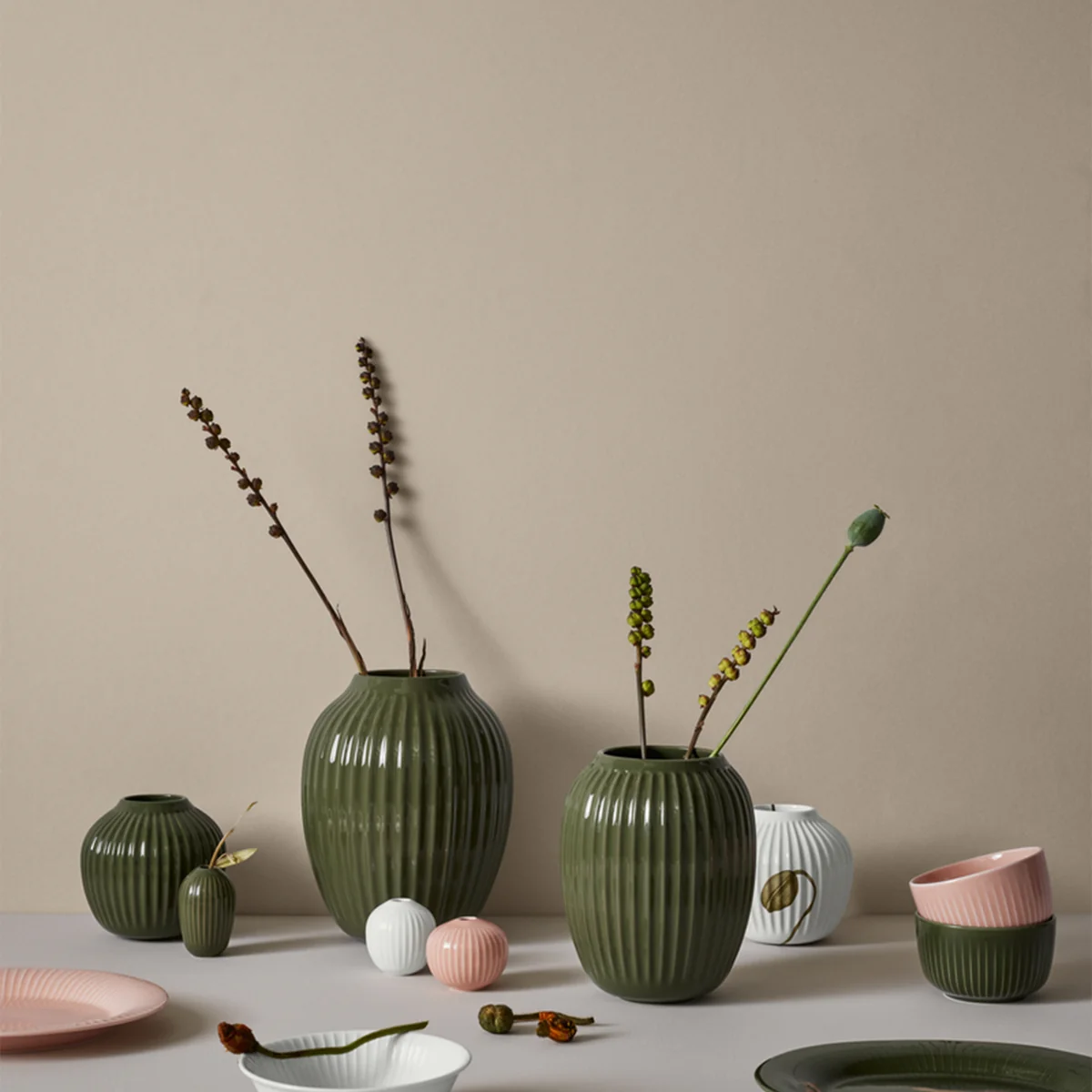 Les impressionnants vases de Kähler Design avec le motif caractéristique des rainures appartiennent à la série conçue par Hans-Christian Bauer. Hammershøi série conçue par Hans-Christian Bauer. Pour les vases et l'ensemble de la série, Bauer s'est inspiré des vases volumineux de Svend Hammershøi vases, qu'il a créés dans l'atelier Kähler vers 1900.