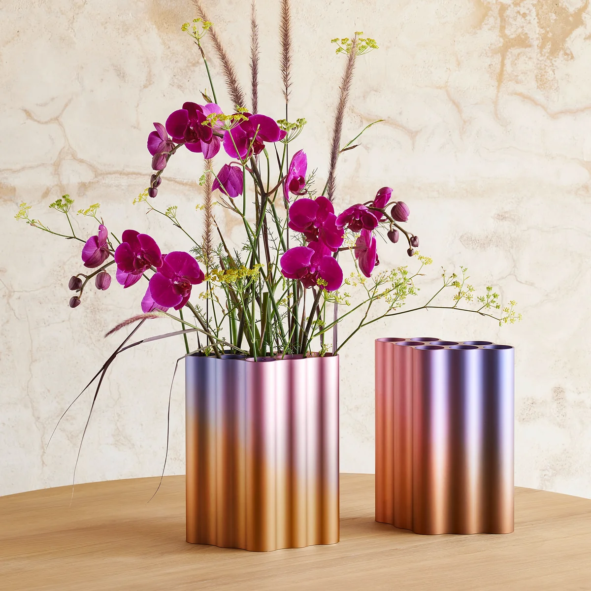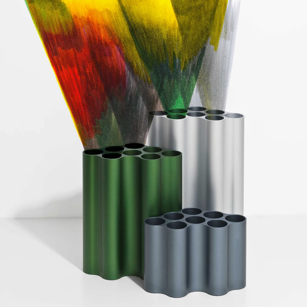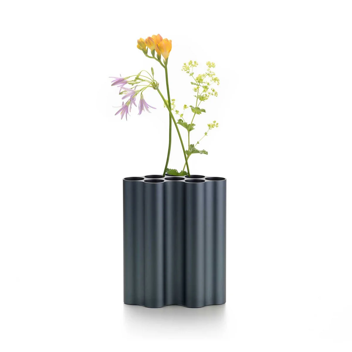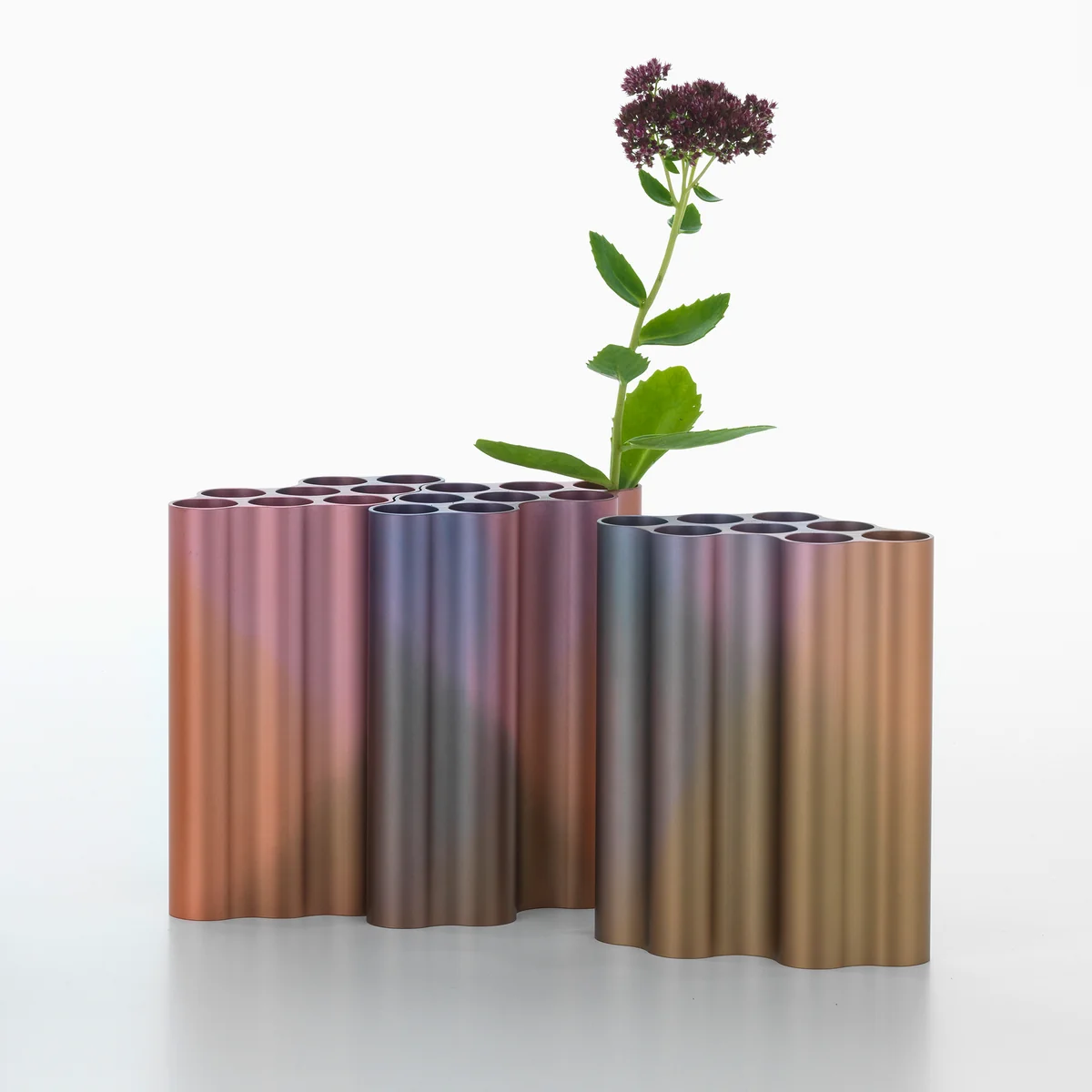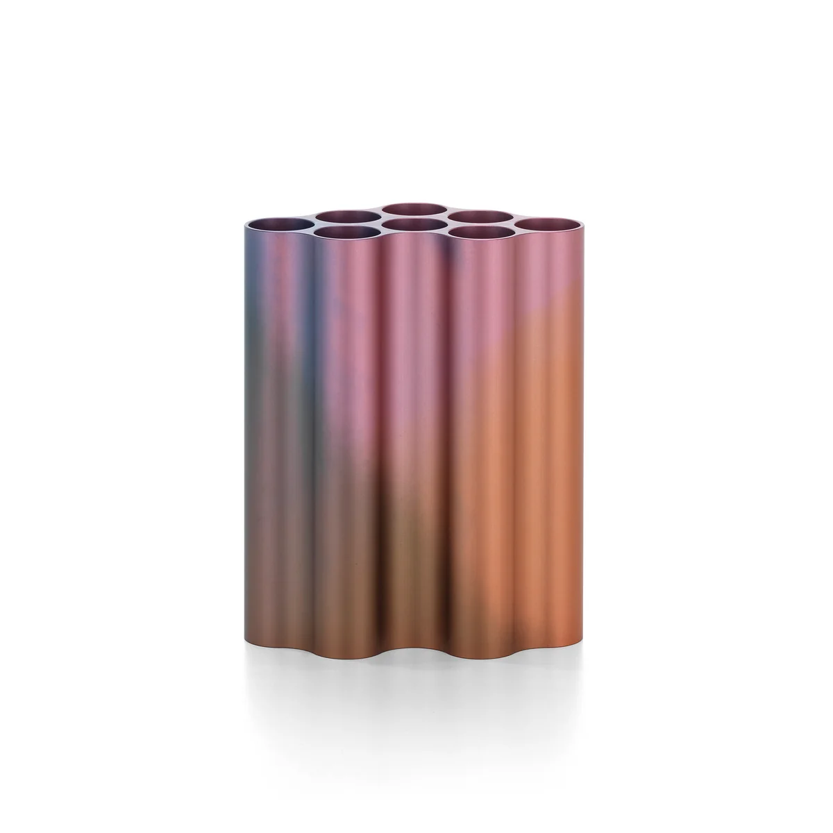 Pour le vase, les Nuage les designers ont étiré la forme du nuage en différentes longueurs à partir de profilés en aluminium massifs. La forme de base est maintenant utilisée en position verticale, le vase est ainsi divisé en huit tubes individuels dans lesquels des compositions de fleurs et d'herbes peuvent être placées. Les surfaces colorées et anodisées en forme de vagues créent un jeu d'ombre et de lumière séduisant.
