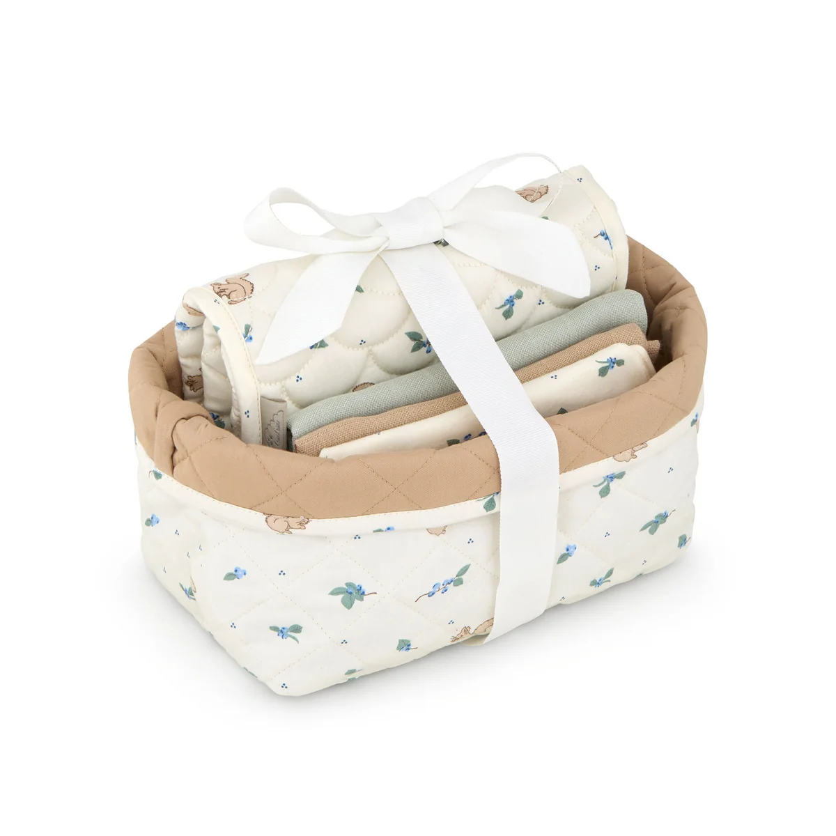 Le set cadeau parfait pour les nouveaux parents : ce set Baby Care composé avec amour combine nos essentiels préférés en coton 100% bio. Il comprend un panier de rangement matelassé (la plus grande taille du set de deux), idéal pour tout ce que tu veux avoir à portée de main sur la table à langer. S'y ajoutent deux bavoirs doux, un matelas à langer pratique pour les déplacements et deux lingettes en mousseline unies - des aides indispensables au quotidien de la famille.