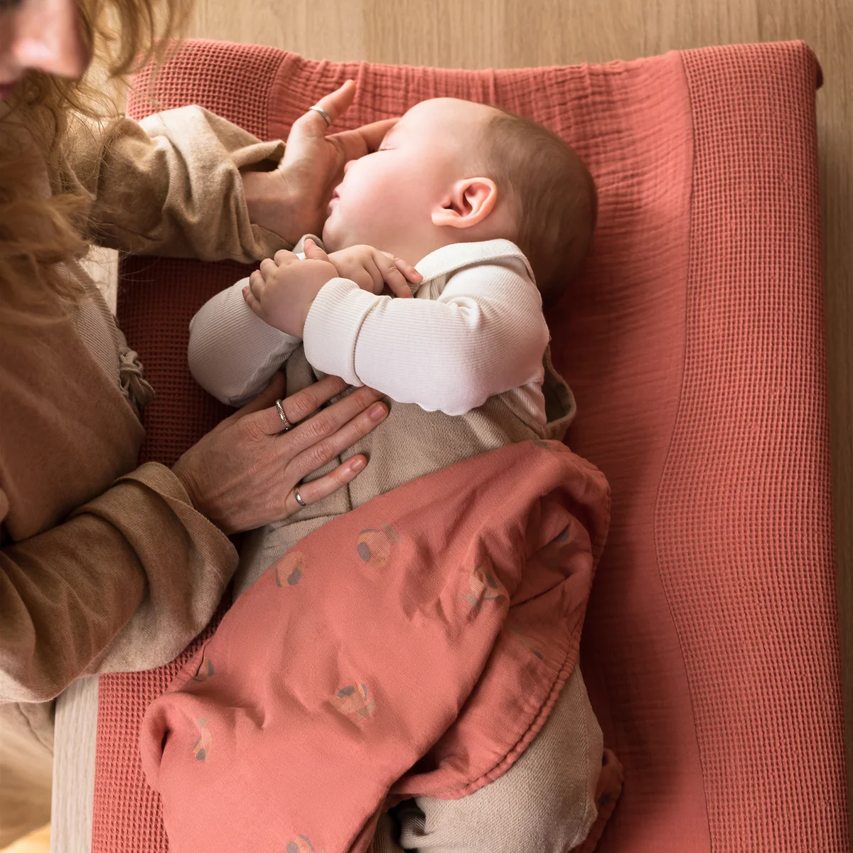 Les imperfections dans le design de la housse lui donnent du caractère et de l'individualité, tandis que les couleurs délicates et la surface douce et rembourrée créent une atmosphère calme et paisible, parfaite pour changer et soigner votre bébé.
