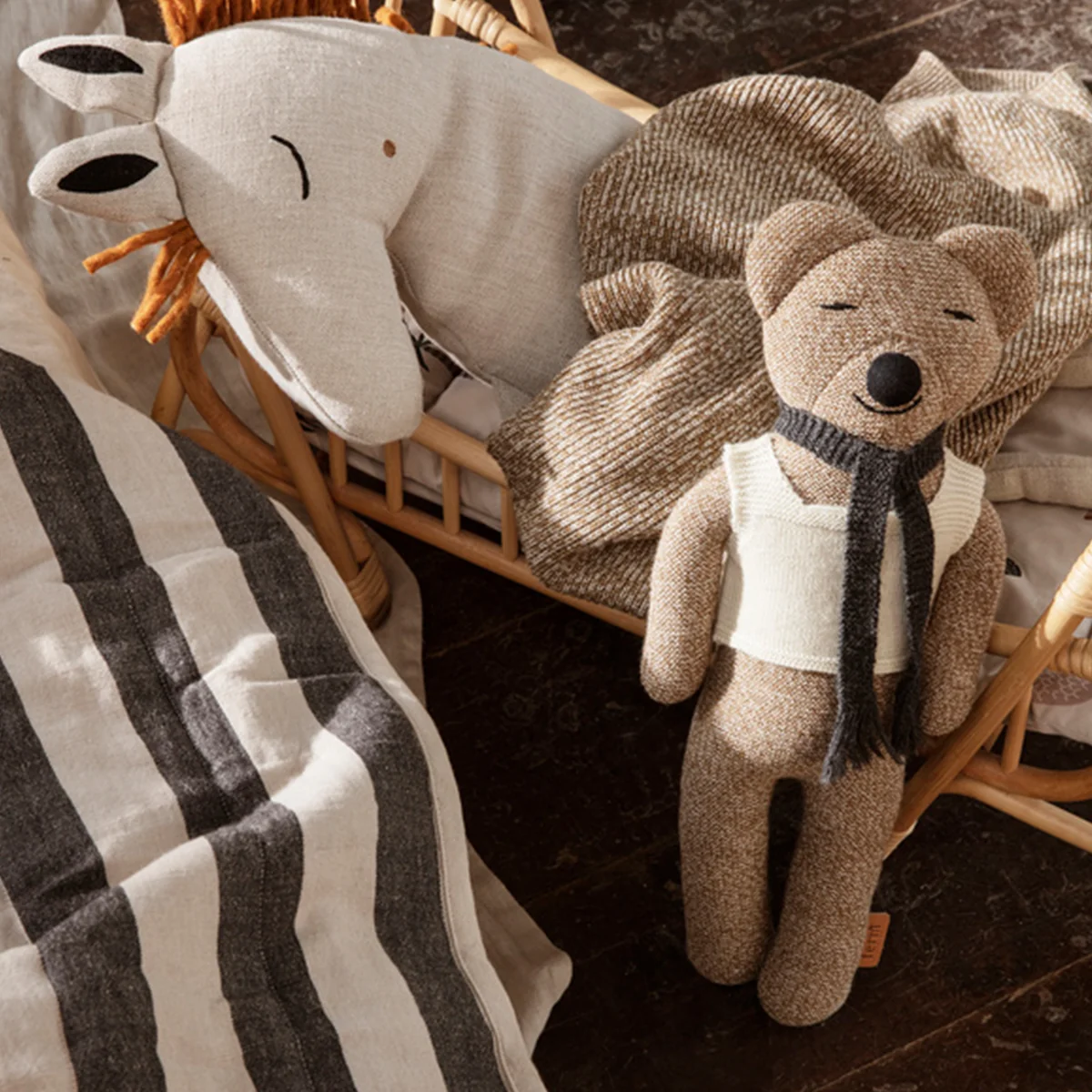 L'ami Roy L'ours en peluche de Ferm Living fait briller les yeux des enfants ! Vêtu d'un joli gilet et d'une écharpe en tricot, il est prêt à s'amuser et à partir à l'aventure. Roy est fabriqué en douce laine mérinos de Nouvelle-Zélande, ce qui lui donne un pelage très doux. L'ami parfait pour les câlins, les jeux et le réconfort.