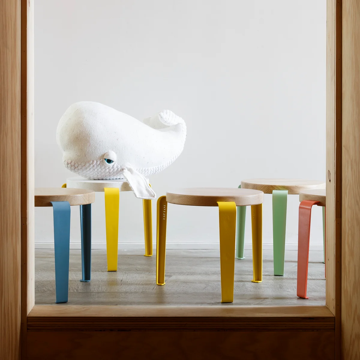 L'assise de MINI LOU est fabriquée en chêne massif certifié OEKO provenant de forêts gérées de manière durable Les pieds de la table sont fabriqués en acier recyclable. Le tabouret pour enfants peut être utilisé comme siège ou comme support pour les pieds. Il est disponible en différentes couleurs.