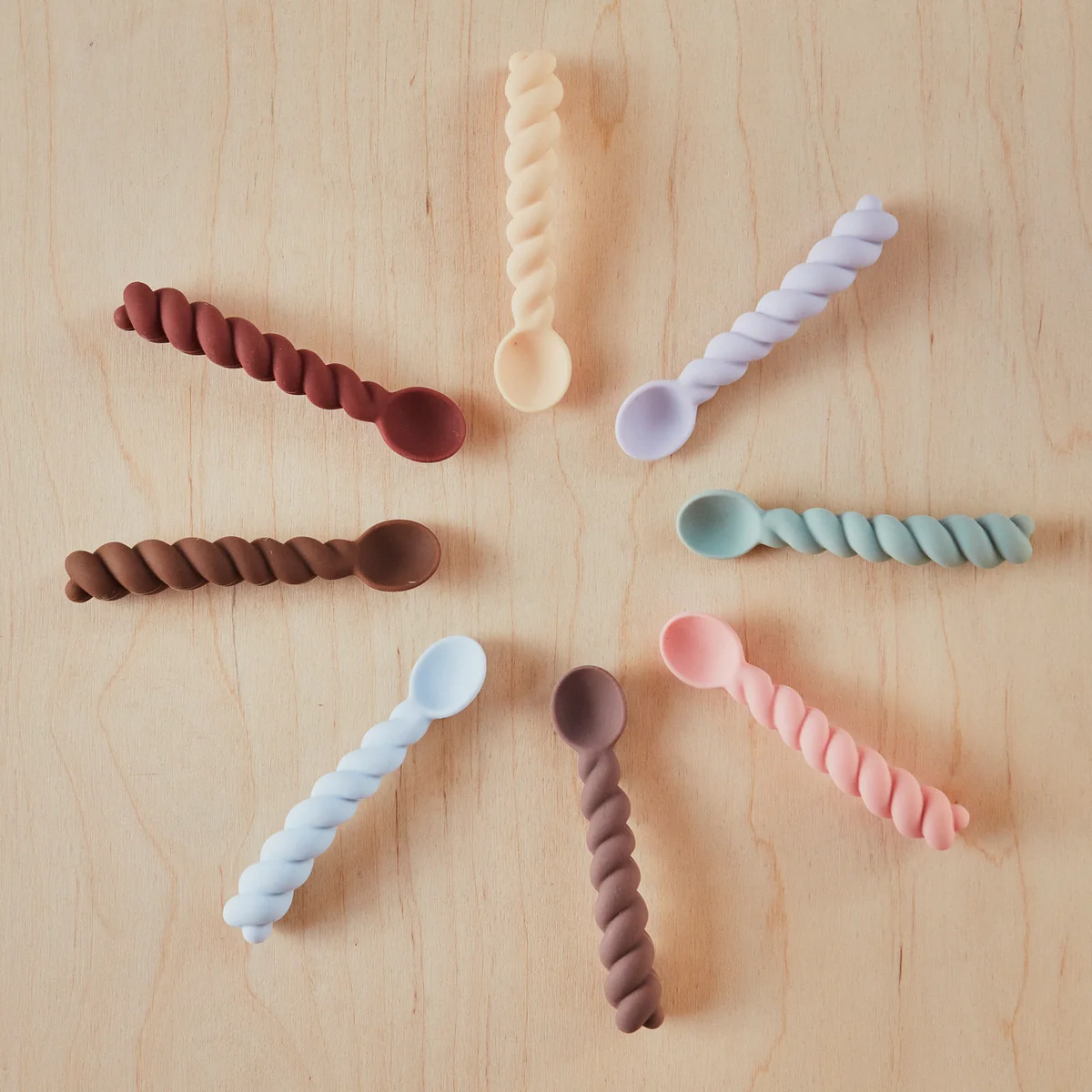 Les cuillères Mellow de OYOY sont des couverts pour enfants uniques, idéaux pour les mains des petits. Le design du manche rappelle deux cordons qui ont été torsadés et enthousiasme au moins autant que les couleurs gaies.