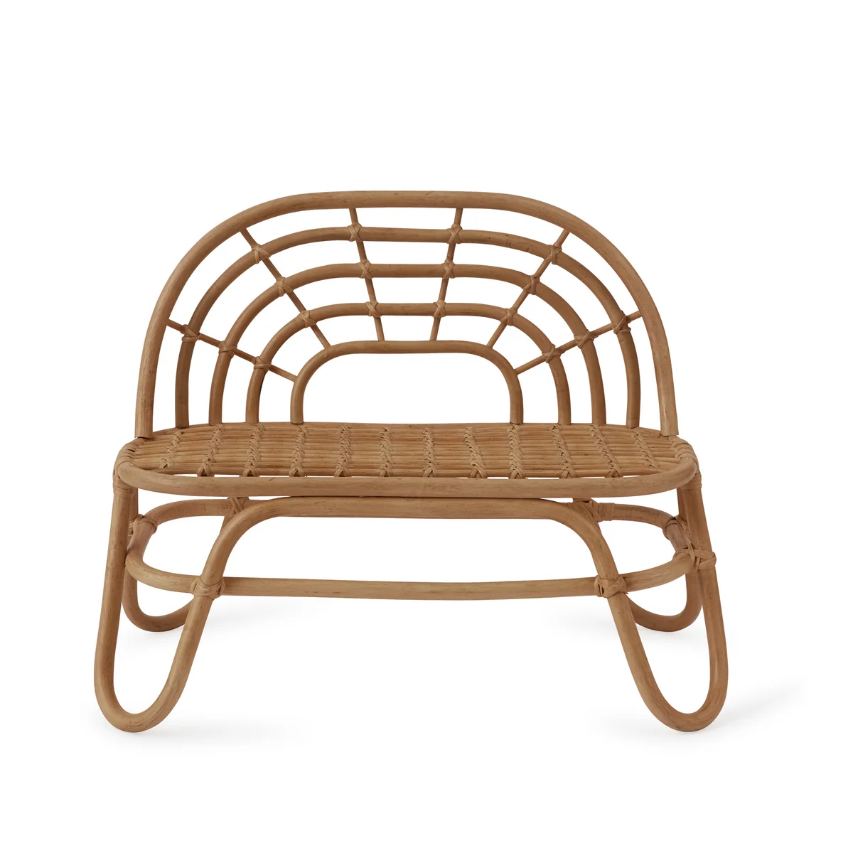 Le banc des enfants est en rotin. Les barres courbes ainsi que le siège tissé donnent un aspect naturel à la chambre des enfants.